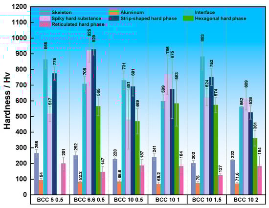 Figure 14 presents the microhardness test results for various phases in samples with different aspect ratios. Measurements of the different micro-constituent phases reveal significant differences in their hardness values, which are closely related to the phase type, morphology, and sample parameters. The test results indicate that the aluminum matrix consistently exhibits the lowest hardness in all samples, stabilizing at approximately 140 Hv, which aligns with the inherent properties of pure aluminum. In contrast, the stainless steel framework, serving as the reinforcement, demonstrates the highest hardness, generally exceeding 250 Hv, significantly strengthening the composite material. Notably, various hard phases distributed within the interfacial bonding region and the aluminum matrix display exceptionally high hardness values. Specifically, the interfacial hard phase and the lath-shaped hard phase in the BBC-6.6-0.5 sample reached peak hardness values of approximately 925 Hv and 929 Hv, respectively, far exceeding those of similar phases in other samples. This suggests that, under this specific geometric parameter, the interfacial reaction likely generated intermetallic compounds (such as Fe-Al and Al-Cr phases) with a higher volume fraction or greater strengthening effect.