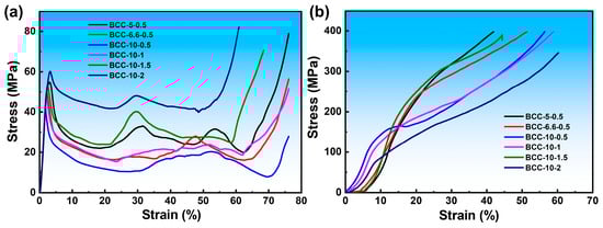 Figure 15 shows the compression stress–strain curves for 316L reinforcement material and 316L lattice/aluminum composite. Aluminum exhibits a low yield strength, typically resulting in a flat compression stress–strain curve that demonstrates excellent plastic deformation capability and toughness [29]. As shown in Figure 15a, the stress–strain curve of the 316L lattice structure exhibits the typical three-stage characteristics of porous materials, with the curve being controlled by the aspect ratio. The plateau region of the BCC-10-0.5 curve features low stress and significant fluctuations, manifesting macroscopically as Euler buckling and progressive layer-by-layer collapse. Each sudden drop and rebound in load, along with the formation of localized plasticity and redistribution of load, directly corresponds to the “severe disordered collapse” observed at the microscopic level. In contrast, the curve plateau of BCC-5-0.5 is more stable. It is speculated that the smaller lattice diameter tends to undergo plastic yielding and bending deformation, resulting in a more uniform failure process. In this system, the mechanical behavior is entirely governed by the topological geometry of the framework, with the aluminum matrix (if present) playing only a limited role in filling and constraining.
