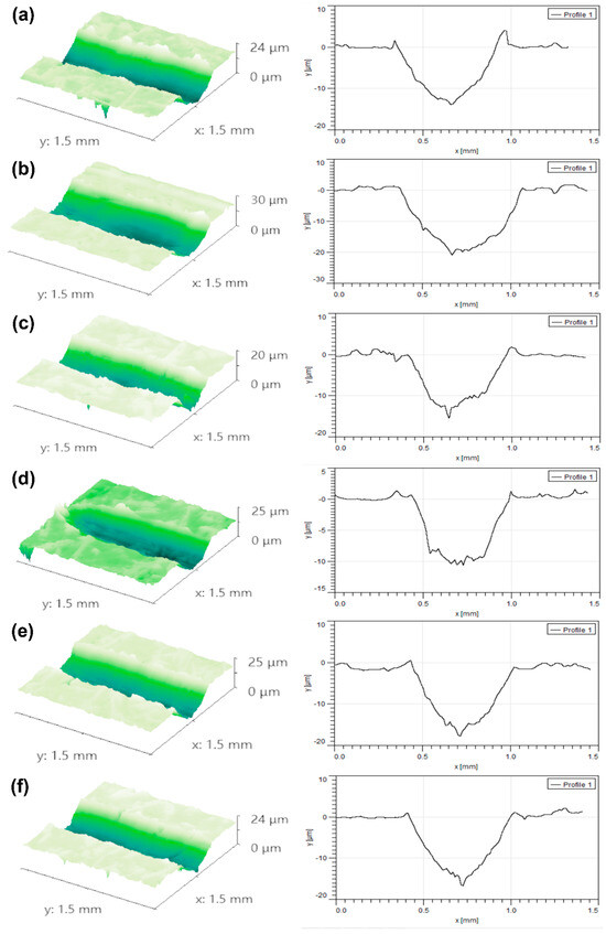 Two-dimensional and 3D morphologies of the reciprocating friction and wear scars: (a) BCC-5-0.5; (b) BCC-6.6-0.5; (c) BCC-10-0.5; (d) BCC-10-1; (e) BCC-10-1.5; (f) BCC-10-2.