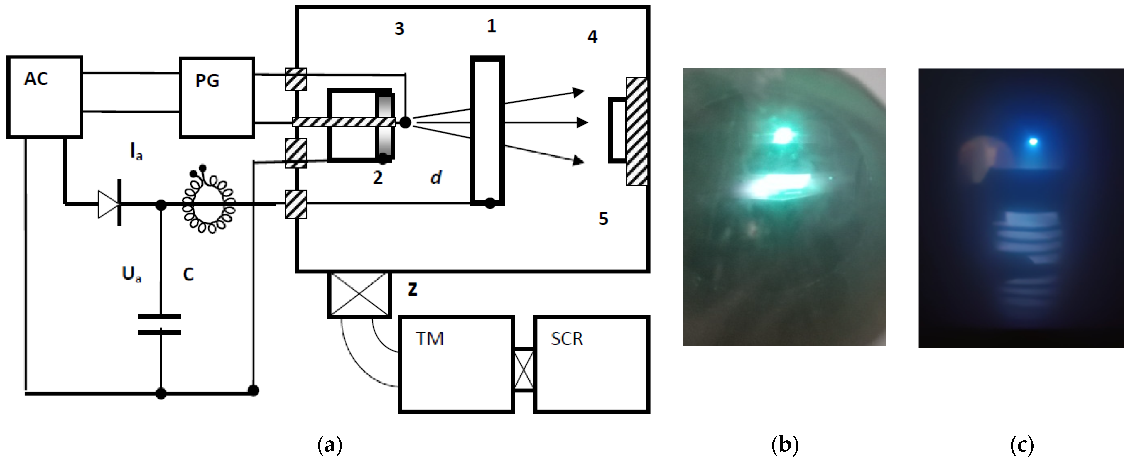 Figure 1a. Inside the vacuum chamber (5), two coaxially positioned cylindrical electrodes—the anode (1) and the cathode (2)—are placed at a separation distance of d = 3–6 cm. When a constant voltage is applied across the electrodes, electrical breakdown does not occur because vacuum serves as an excellent insulator. Once the discharge is initiated by a high-voltage triggering pulse, plasma is first generated through spark breakdown between the cathode and the ignition electrode (3). The plasma then expands from the cathode surface toward the hollow anode and is subsequently directed onto the substrate (4). The substrate is mounted on a ceramic holder or can be electrically grounded.