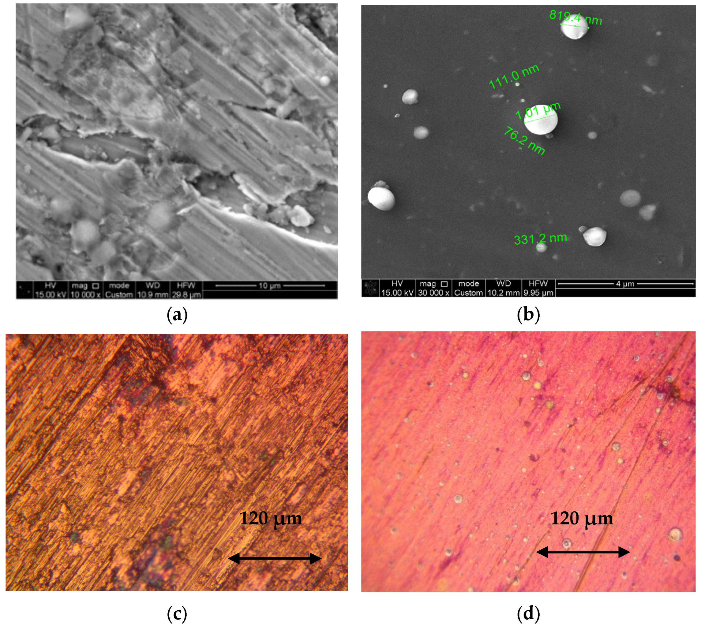 Surface topography was examined using a DM6000 optical microscope (OM) and a Quanta 3D 200i scanning electron microscope. The microscope’s microanalysis system was equipped with an energy-dispersive X-ray spectroscopy (EDAX) module with an energy resolution of 132 eV (Mn Kα). The SEM operated at accelerating voltages from 200 V to 30 kV, providing a spatial resolution of 2.5 nm in high-vacuum mode. Sample topography was also analyzed with a QUANTA-200i system. Although referred to as an AFM in earlier documentation, this instrument is in fact an SEM combined with a focused ion beam (FIB), capable of high-resolution imaging, precision micromachining, and 3D surface analysis. It provides imaging resolutions of 3 nm at 30 kV in HV/ESEM mode and 12 nm at 3 kV in low-vacuum mode.