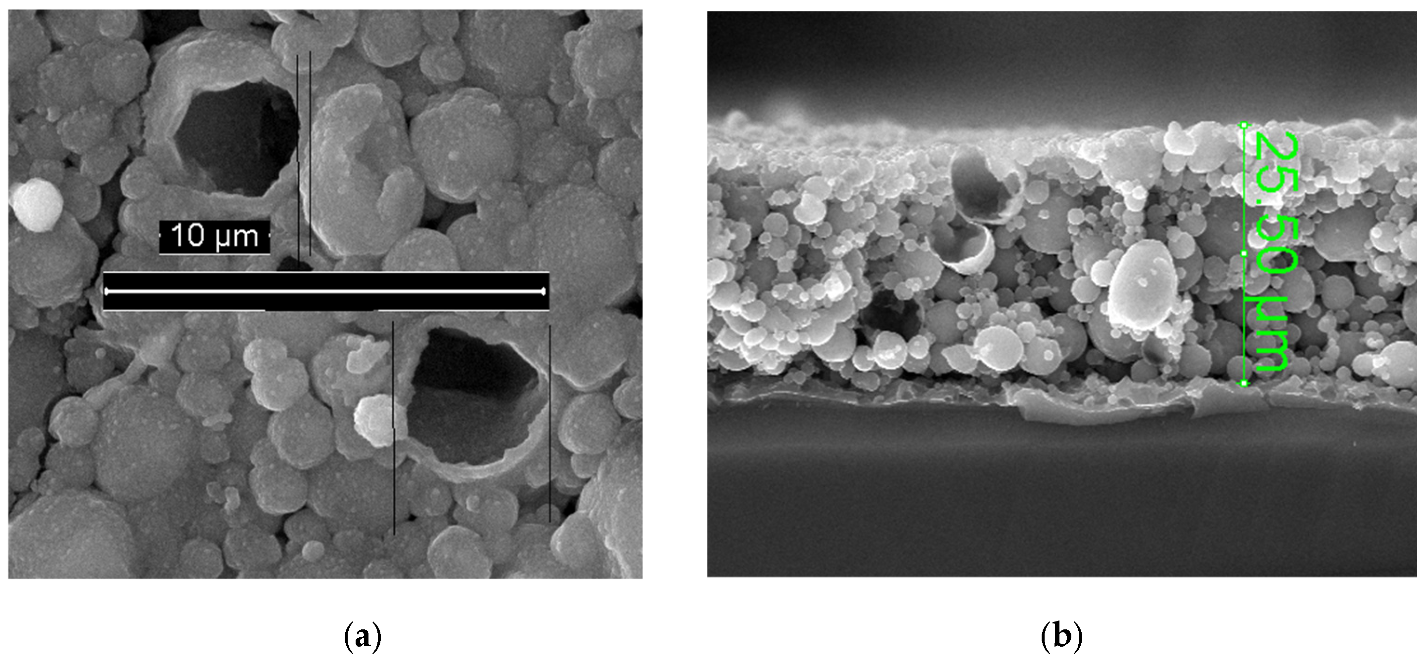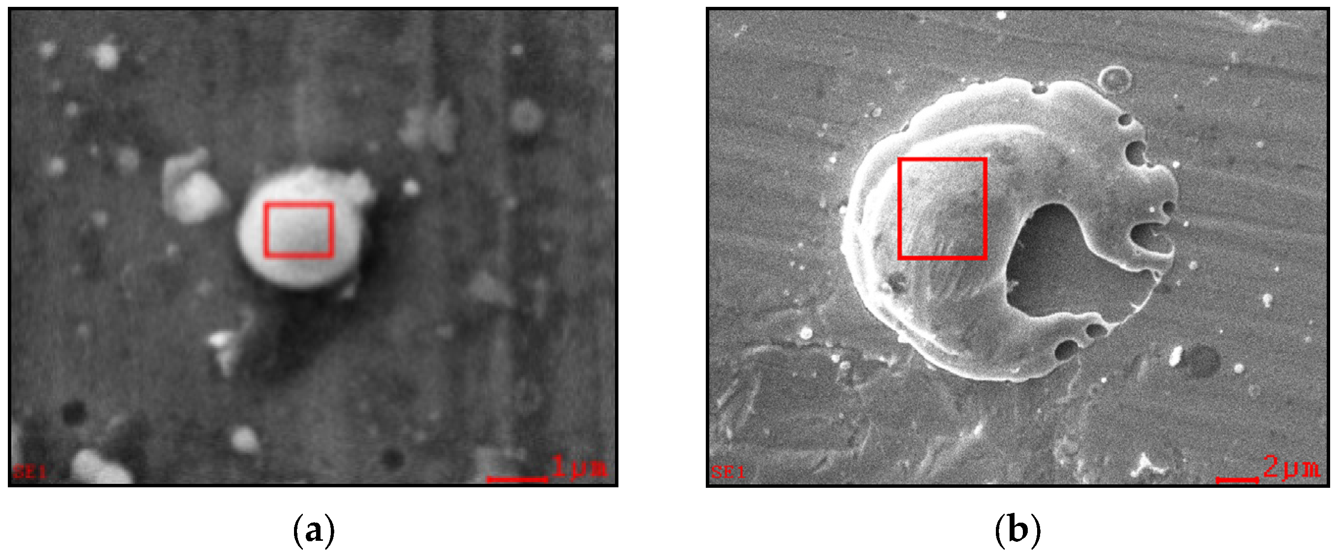 Figure 8a, the particle wall thickness is 0.3 ± 0.1 µm, and the two largest particles measure approximately 4 ± 1 µm. In