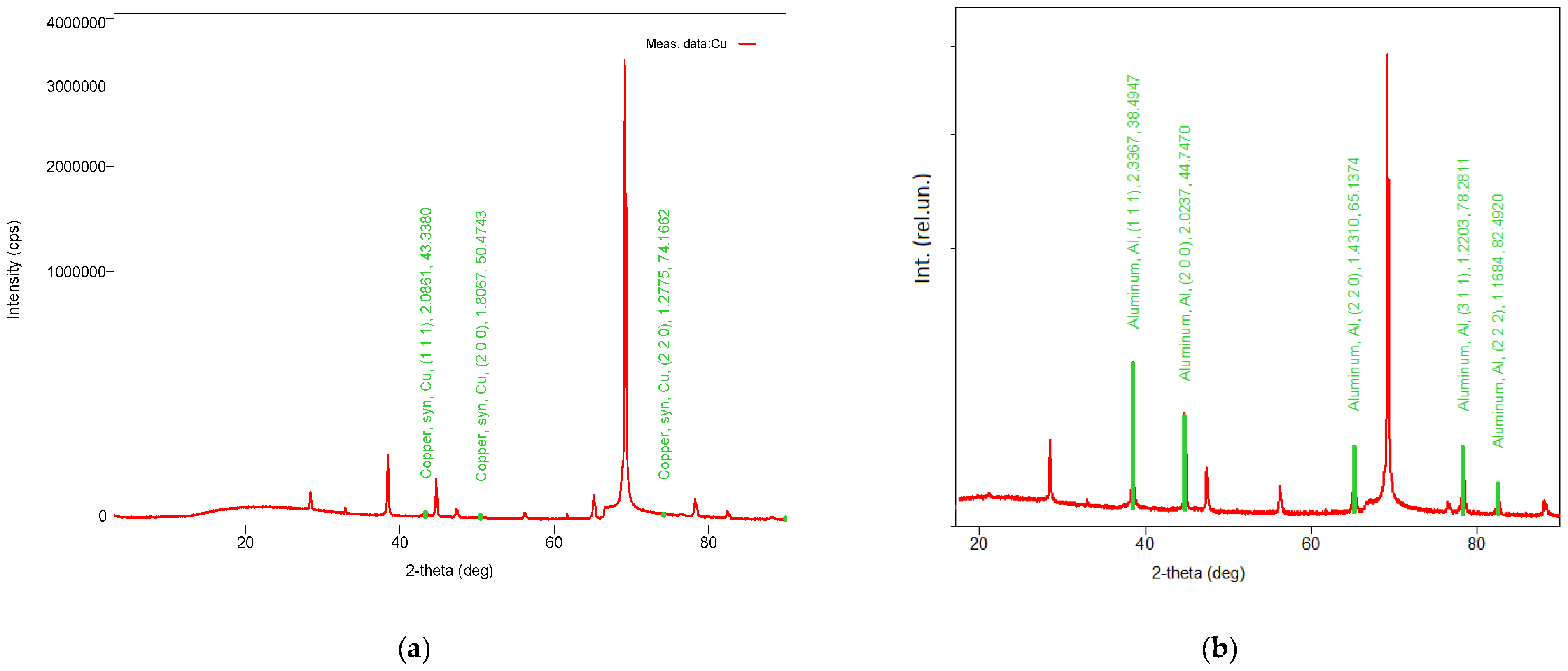 Figure 7 shows that both copper and aluminum exhibit a crystalline structure, although the number of diffraction peaks varies. Since the substrate consists of silicon, the observed metal peaks can be attributed to the surface coatings.