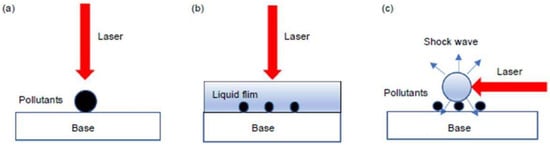 (a) Dry laser cleaning. (b) Wet laser cleaning. (c) Laser cleaning of plasma shock wave [1].