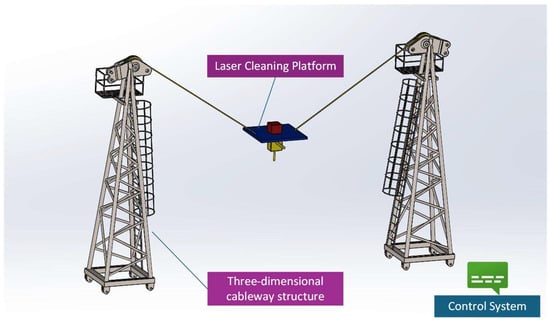 Shao Zhuang et al. [3] developed a three-dimensional cable-guided laser rust removal system using theoretical analysis, finite element simulation, and experimental verification, as illustrated in Figure 2. This three-dimensional cable-guided laser rust removal device is built around a lightweight design idea. It principally uses a support system similar to the “Flying Cat Cable Camera System,” with four support points and four cables forming a three-dimensional movement space. Fully automated operation removes direct manual handling, resulting in greatly improved safety performance. The modular, detachable architecture is also better suited to tough marine situations.