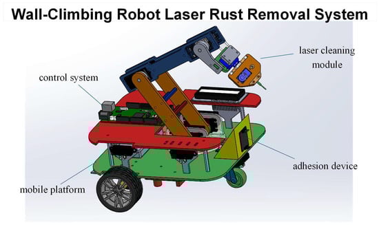 Jiang Mingming et al. [4] developed a pipeline robot with a rust-removal robotic arm. This gadget uses a three-degree-of-freedom robotic arm construction combined with a visual inspection system to precisely remove localized rust corrosion on the pipeline inner walls. Figure 3 depicts the wall-climbing robot’s essential components: a mobile platform, an adhesion device, a laser cleaning module, and a control system. The integrated intelligent sensing and identification modules not only provide improved safety performance but also highly standardized rust removal capabilities, making this an ecologically beneficial and highly efficient solution.