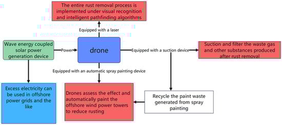 Based on these findings, this research suggests a wave–solar hybrid-powered intelligent rust removal drone as a more suitable solution for offshore wind power operation and maintenance. It consists largely of three major modules: a high-powered laser, vision-based recognition with RTK location, and an intelligent suction-spraying module. This system has characteristics such as environmental sustainability and high intelligence, making it a dependable alternative for intelligent offshore wind energy maintenance. It has substantial practical technical value and provides fresh insights into the sustainable construction of offshore wind towers. Although hurdles remain in assuring stability in extreme environments, this technique represents a step toward intelligent and green maintenance for offshore wind generation, with extensive application prospects in other large-scale marine infrastructure maintenance industries.