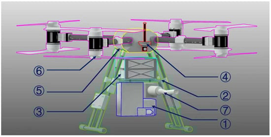 ① is primarily used for long-distance laser rust removal. ② forms the drone’s basic structural support. ③ is a rechargeable battery that can be connected to the power generation platform, providing a stable power supply for subsequent drone operations. ④ is primarily used to determine the drone’s position. ⑤ is used to connect to a computer and control the drone’s operations. ⑦ is for the suction and filtration of dust particles generated after subsequent drone rust removal.