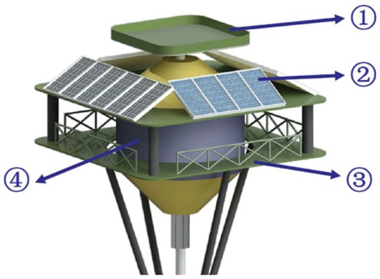 The solar–wave energy coupling device consists of four modules: ① drone landing pad, ② solar panels, ③ manned maintenance platform, and ④ wave energy power generation system. As shown in Figure 6.