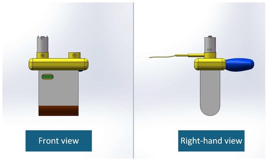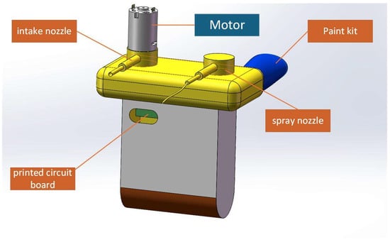This intelligent drone is equipped with an automated spraying and adsorption module [12] (Figure 11 and Table 4). As illustrated in Figure 12, it comprises an intake nozzle, spray nozzle, motor, and processing module. The total weight of the unit is 14 kg. The front spray hose employs a telescopic design with an adjustable range of 0.5 to 2 m. The powered negative pressure suction unit measures 40 × 30 × 30 centimeters and achieves a maximum suction power of 6000 watts. Its front and right-side views are depicted in Figure 13.