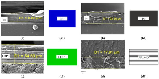 - Film D (PP_MO)—a monoaxially oriented polypropylene film (g = 18 µm), commonly used as an external layer in packaging due to increased stiffness and mechanical resistance.