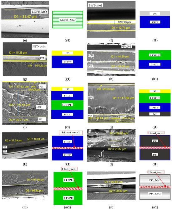 Table 1 presents a set of eleven types of polymer-based packaging films, labeled with letters A through K, selected for their representativeness of the packaging materials currently used. The selection includes both monolayer and multilayer films, varying in chemical composition, thickness, functional surface layers (e.g., printing, metallization), and manufacturing technology (orientation, lamination, coating).