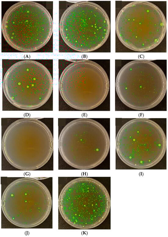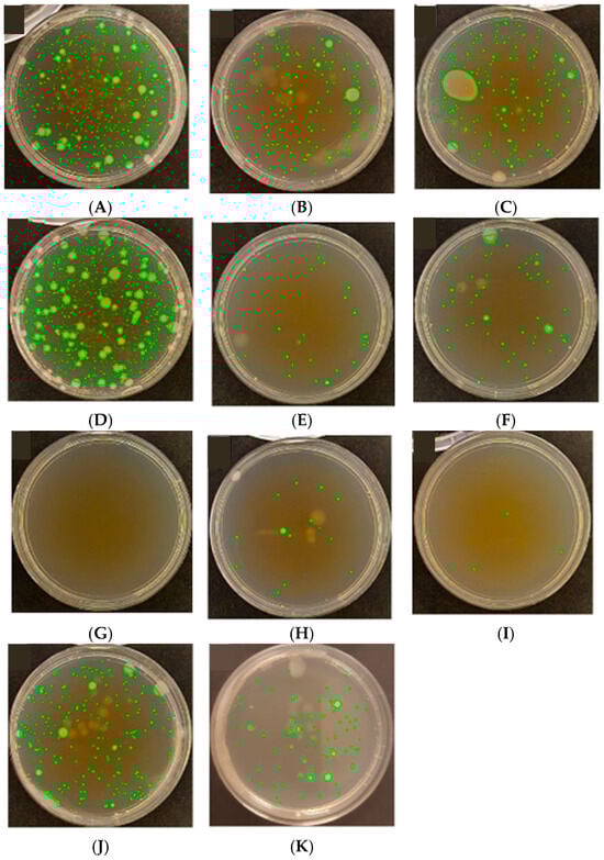 Images of the plates with colonies were captured using a digital camera and analyzed with a MATLAB (R2024a) script that automatically identified and counted colonies based on pixel intensity thresholds. These thresholds were established through calibration tests using known CFU concentrations and were compared with manual colony counts, which allowed for validation of the script’s effectiveness and accuracy. This procedure ensured consistency of the results and minimized errors associated with variations in illumination and image contrast.