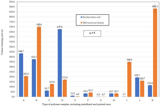 For the purposes of microbiological surface characterization and assessment of antibacterial and antiviral activity, each sample was assigned a unique laboratory code—presented in Table 2. The aim of the test was to evaluate the interaction between the ten types of film samples and bacterial cells; i.e., to determine their antimicrobial activity. The surfaces of the samples tested were cleaned with ethanol (except for the PET-print sample, when cleaning caused surface damage), and subsequently sterilized using UV irradiation for 30 min.