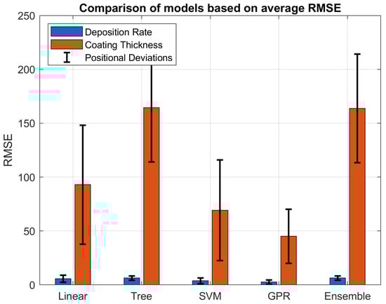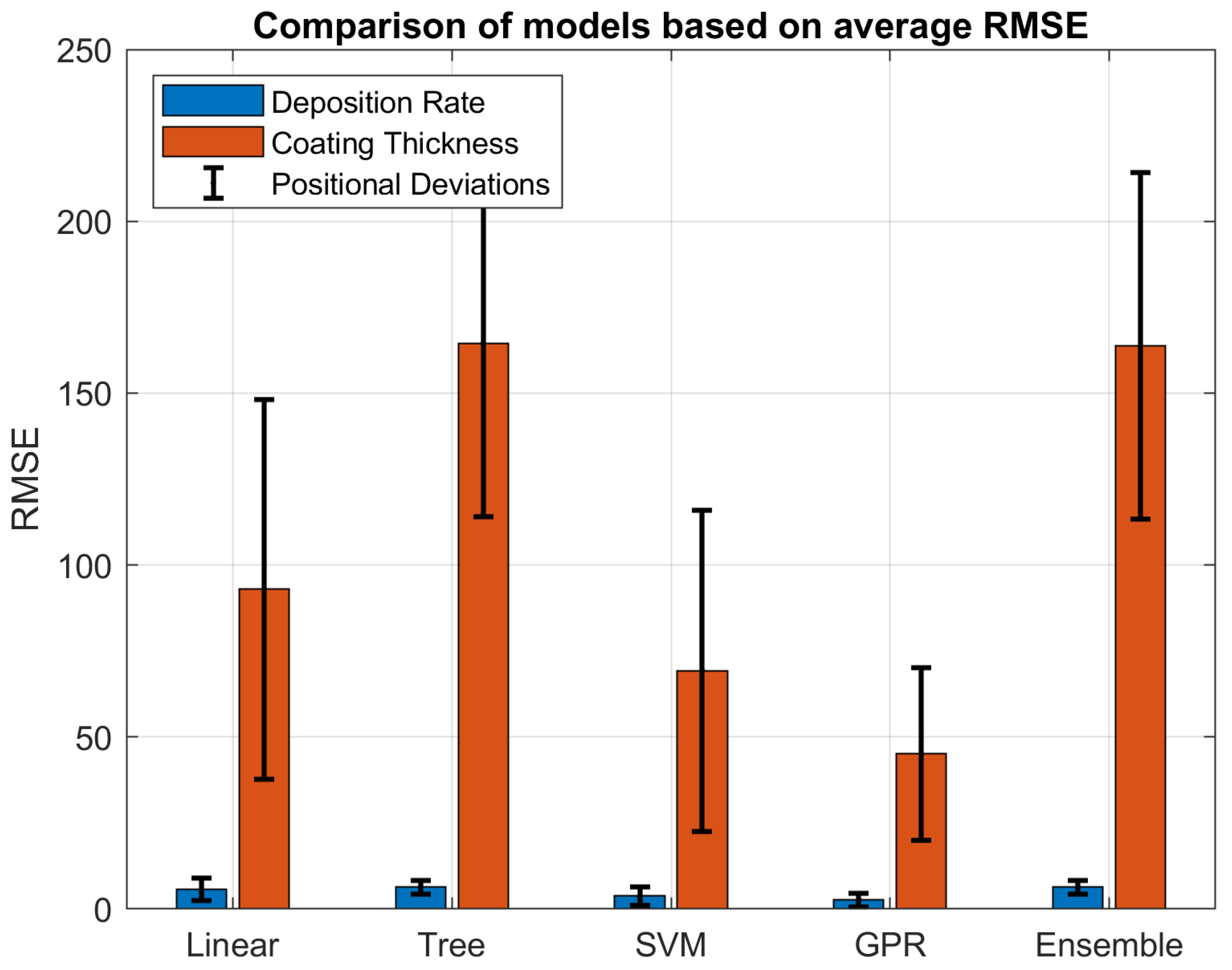 For the deposition rate, all models demonstrate relatively low error (RMSE < 10 nm min−1), indicating that this output is comparatively straightforward to predict. Gaussian Process Regression (GPR) and the SVM exhibit the lowest errors and minimal variability. In contrast, for coating thickness, the differences between models are markedly more pronounced.