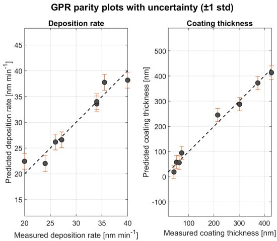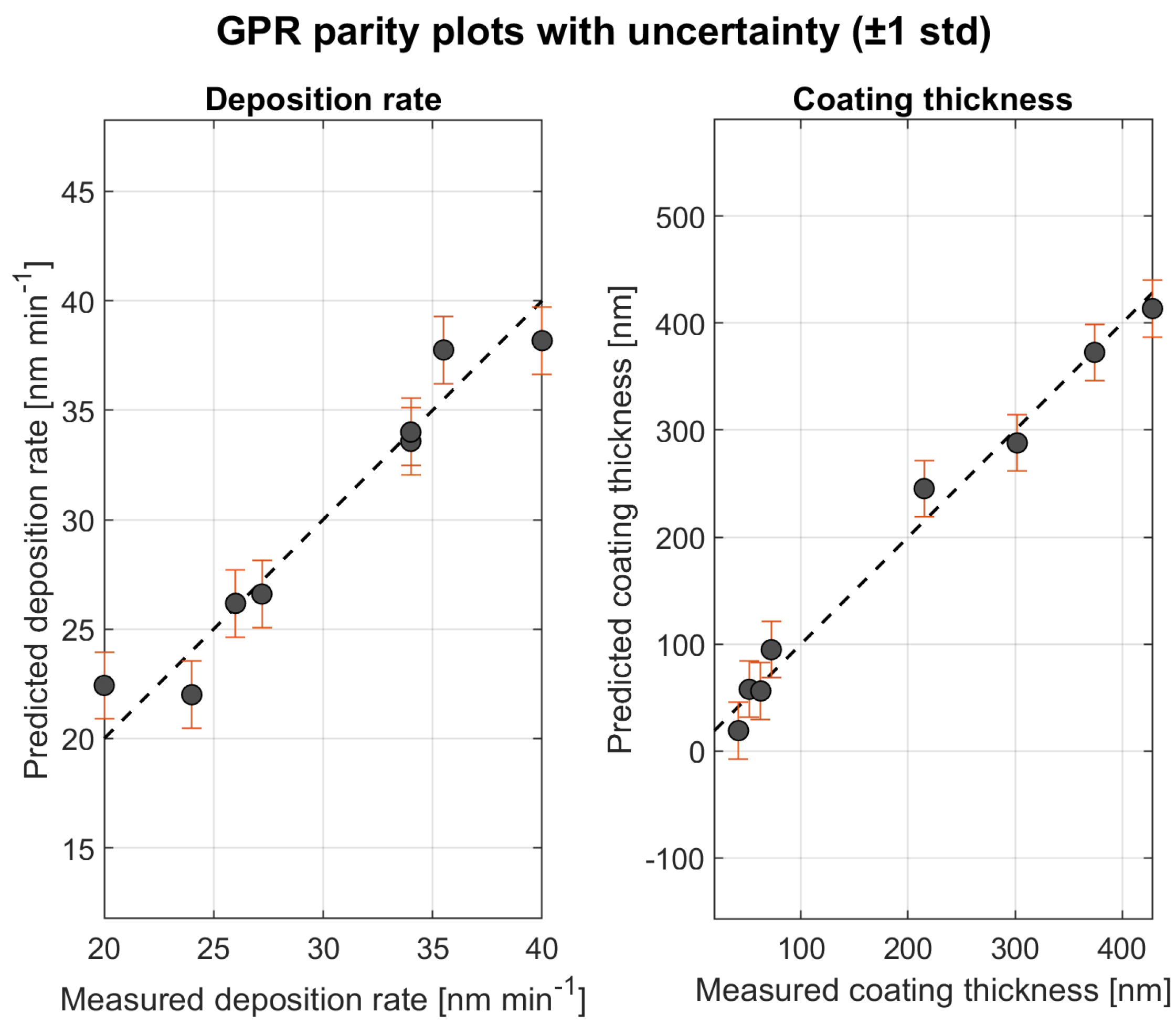 Figure 3, parity plots of the GPR models for deposition rate and coating thickness were generated and are shown in