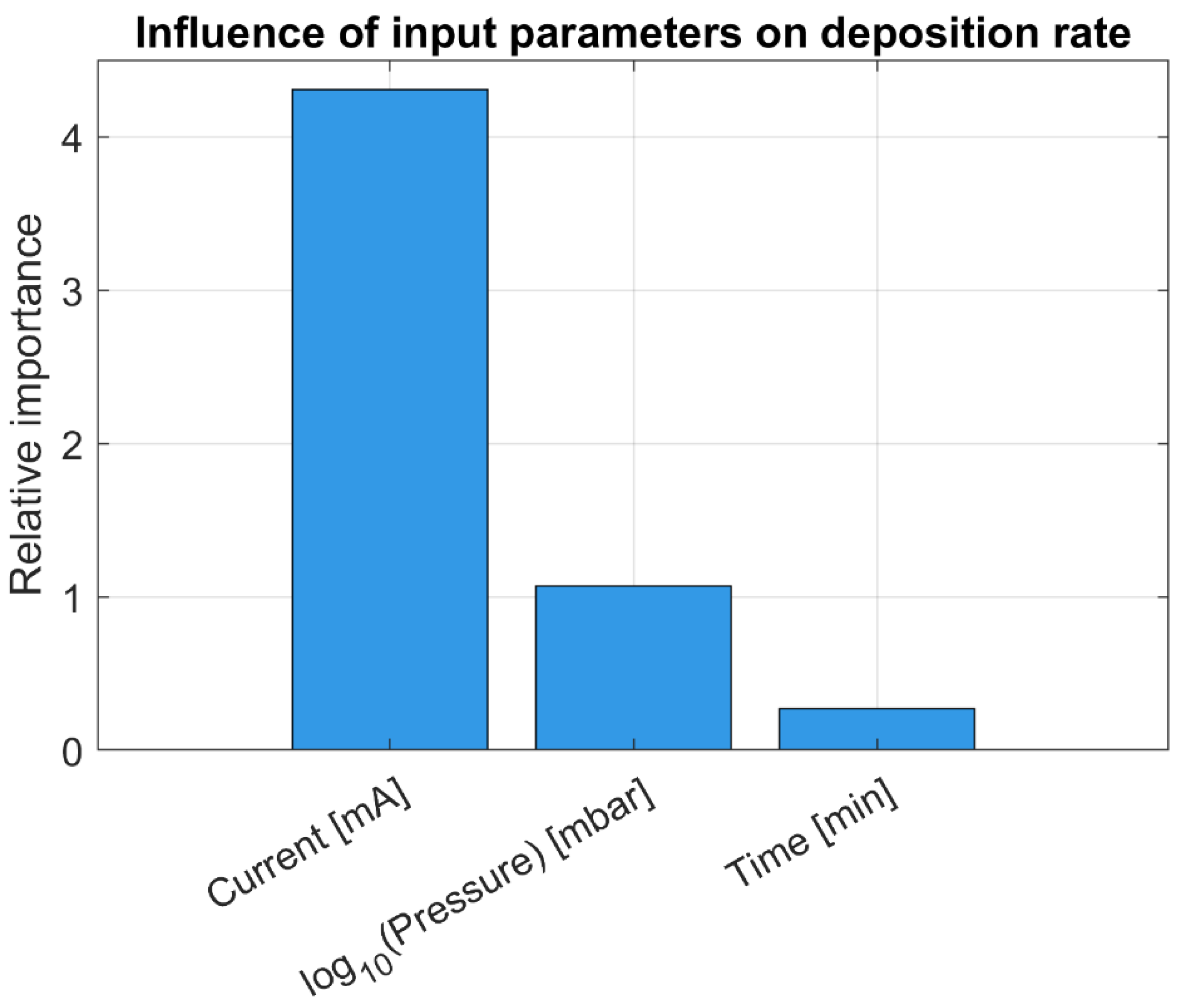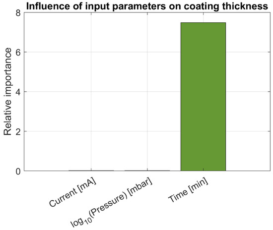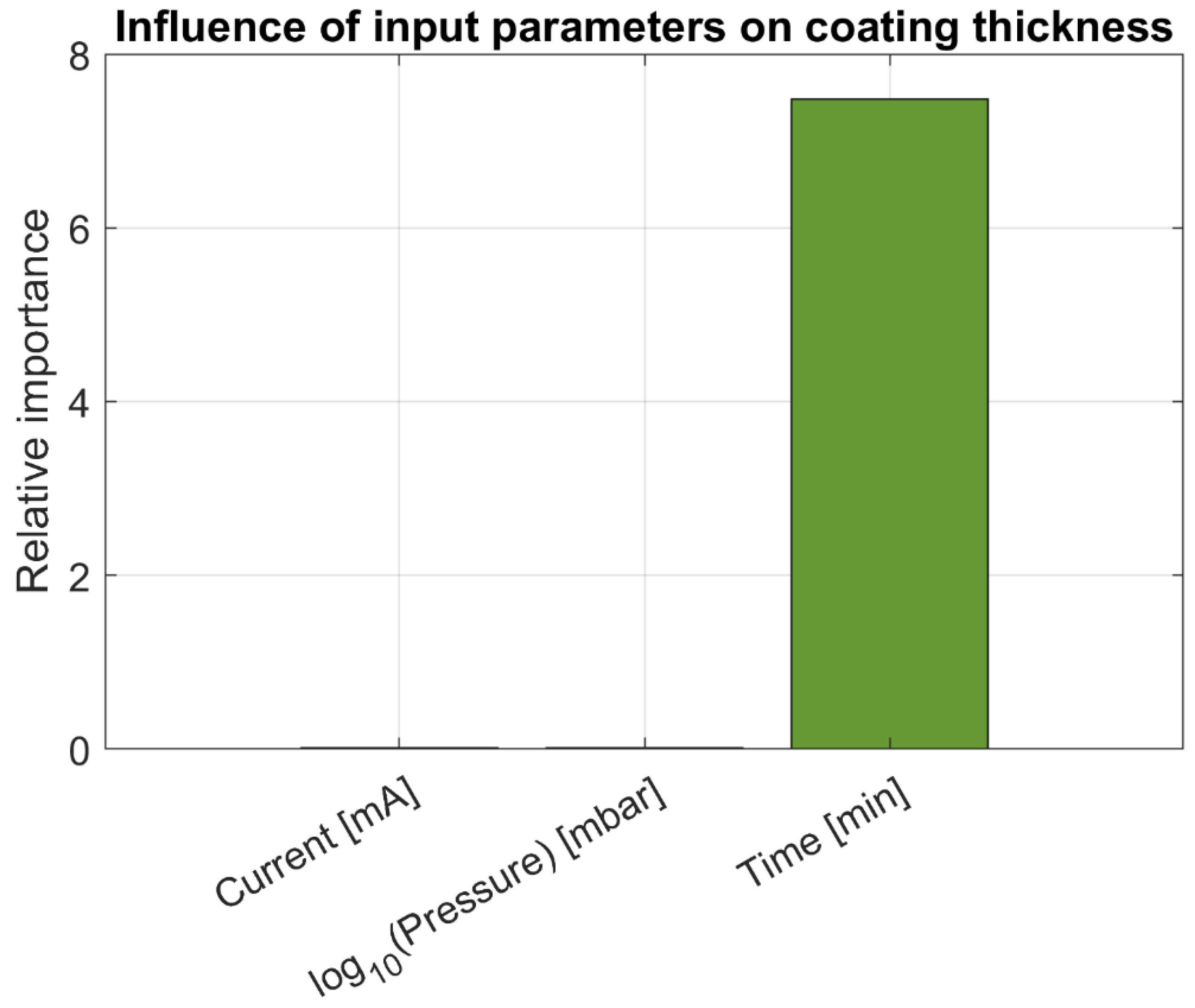 Figure 5). The contributions of discharge current and pressure in this model are negligible, suggesting that within the considered range of values, they do not significantly affect coating thickness. This finding aligns with physical intuition, as longer process durations allow for the deposition of a greater amount of material, whereas at the same time, variations in current or pressure do not result in significant changes. However, due to its inherent nature, the linear model cannot detect potential nonlinear effects of current or pressure. Although such effects are not evident in this case, identifying them would require a more advanced model, such as GPR or nonlinear regression, or a larger experimental dataset, particularly covering an extended range of parameter values.