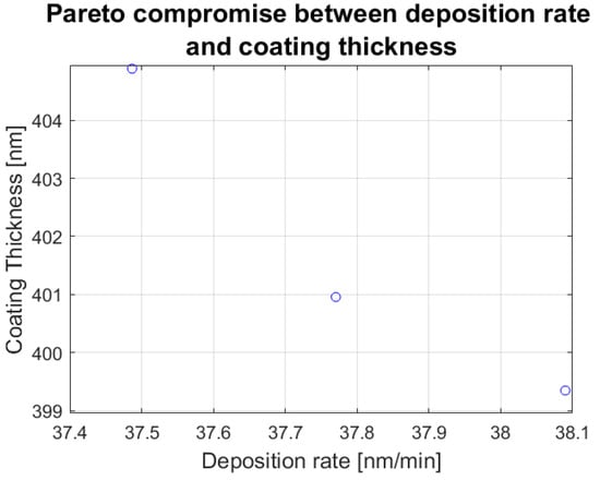 Figure 8). The values of the objective functions deposition rate and coating thickness differ only slightly among individual solutions, implying that, from both a numerical and engineering perspective, there is effectively a single optimal solution.