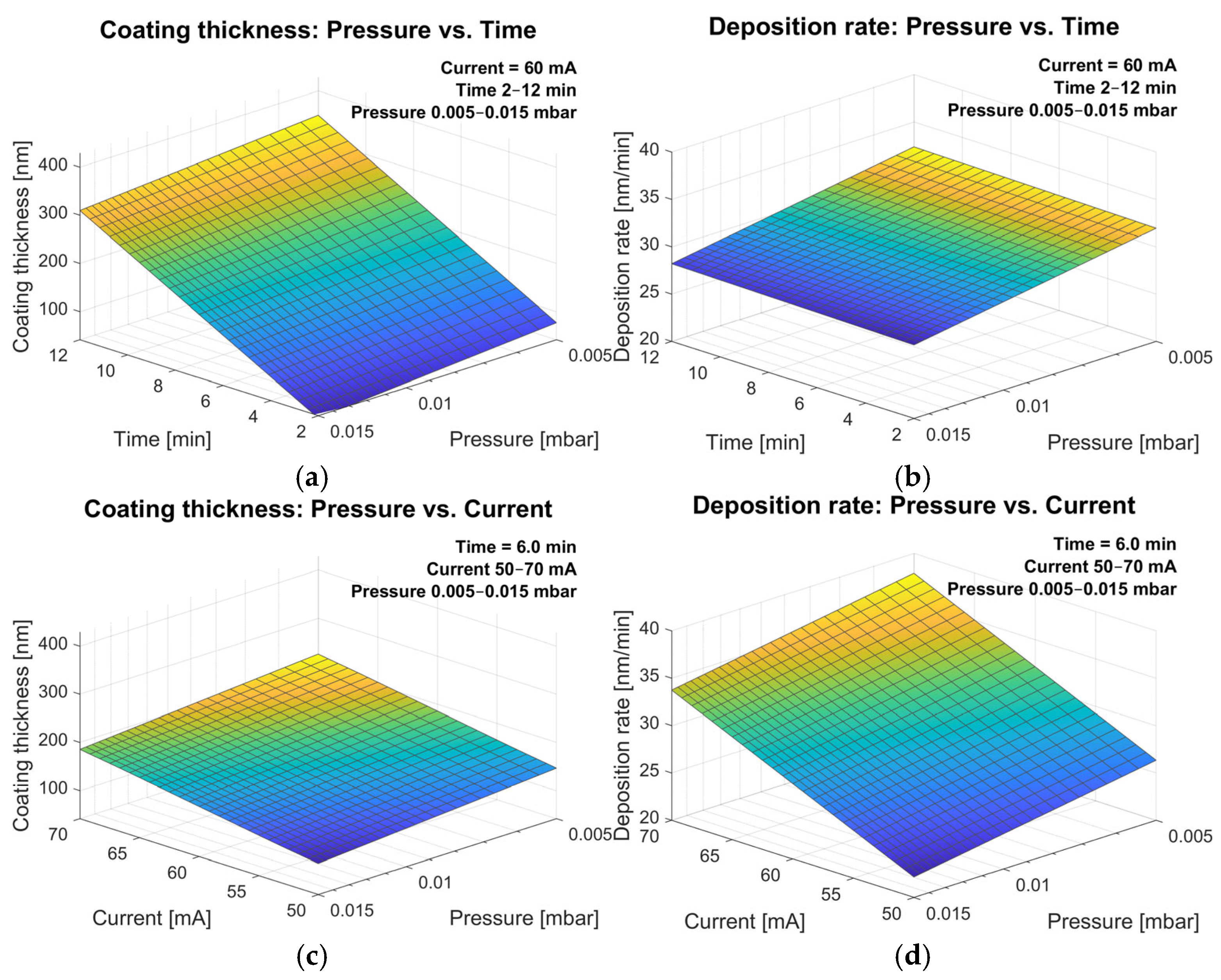 Figure 7b,d,f) show a clear monotonic increase along the discharge current axis, consistent with the expected physical relationship whereby higher current enhances sputtering efficiency. In contrast, the influence of deposition time is minimal, reflecting the steady-state nature of the process, while the effect of pressure within the examined range remains comparatively modest. Consequently, optimization of deposition rate should primarily focus on the discharge current, with pressure and deposition time playing secondary roles.