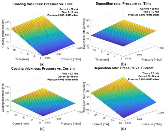 Overall, the results highlight that coating thickness depends mainly on deposition time, with pressure contributing only secondary effects in the examined range of process parameters, whereas deposition rate is primarily governed by discharge current.