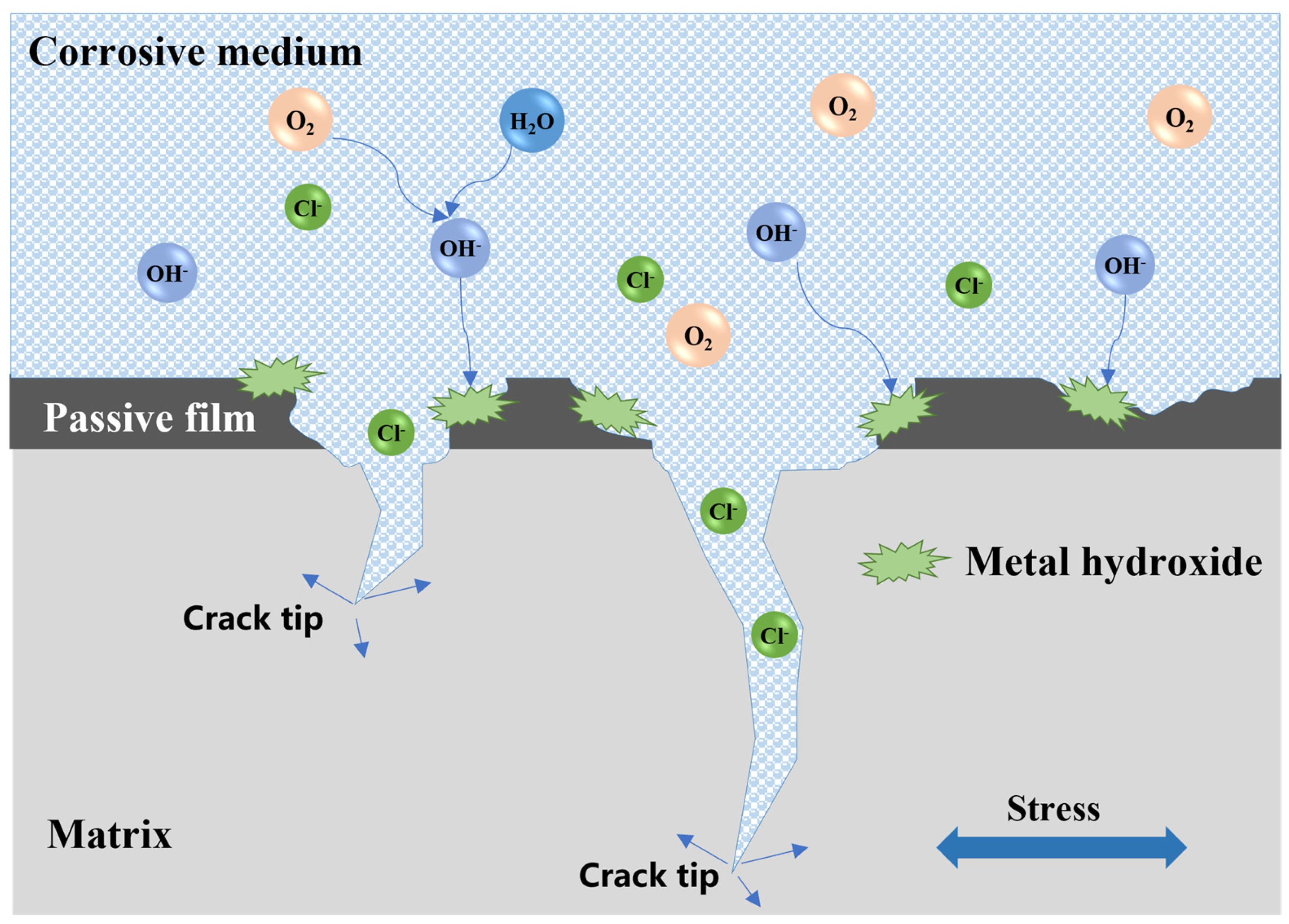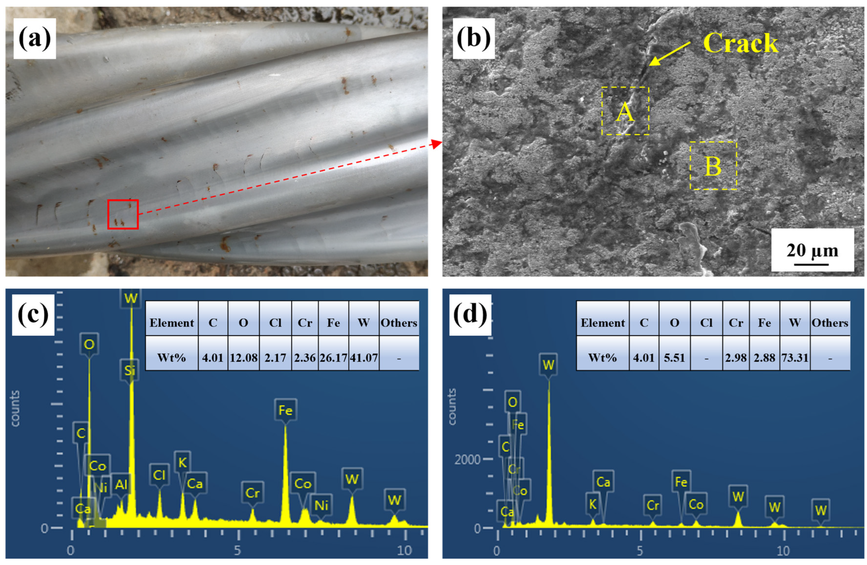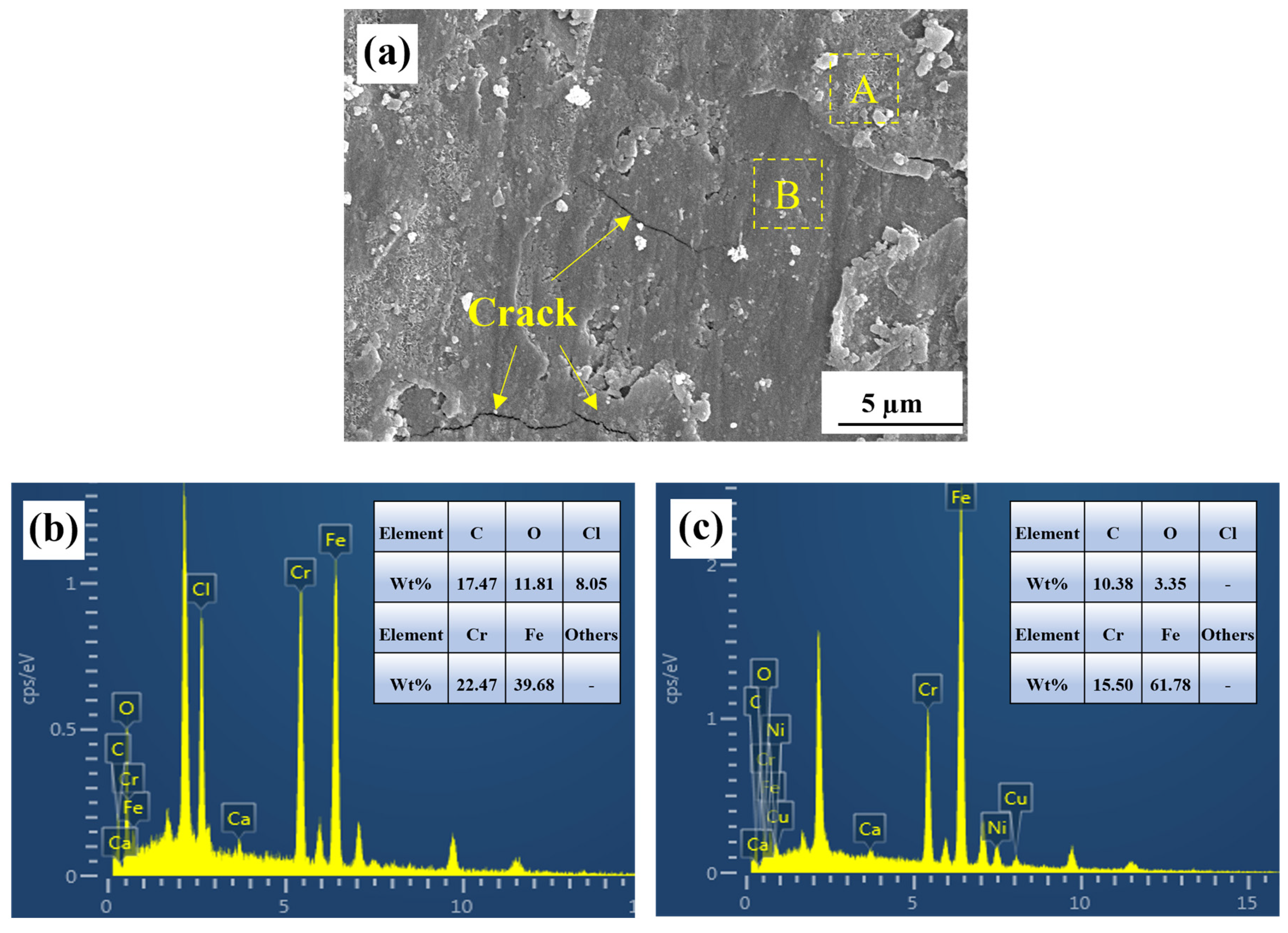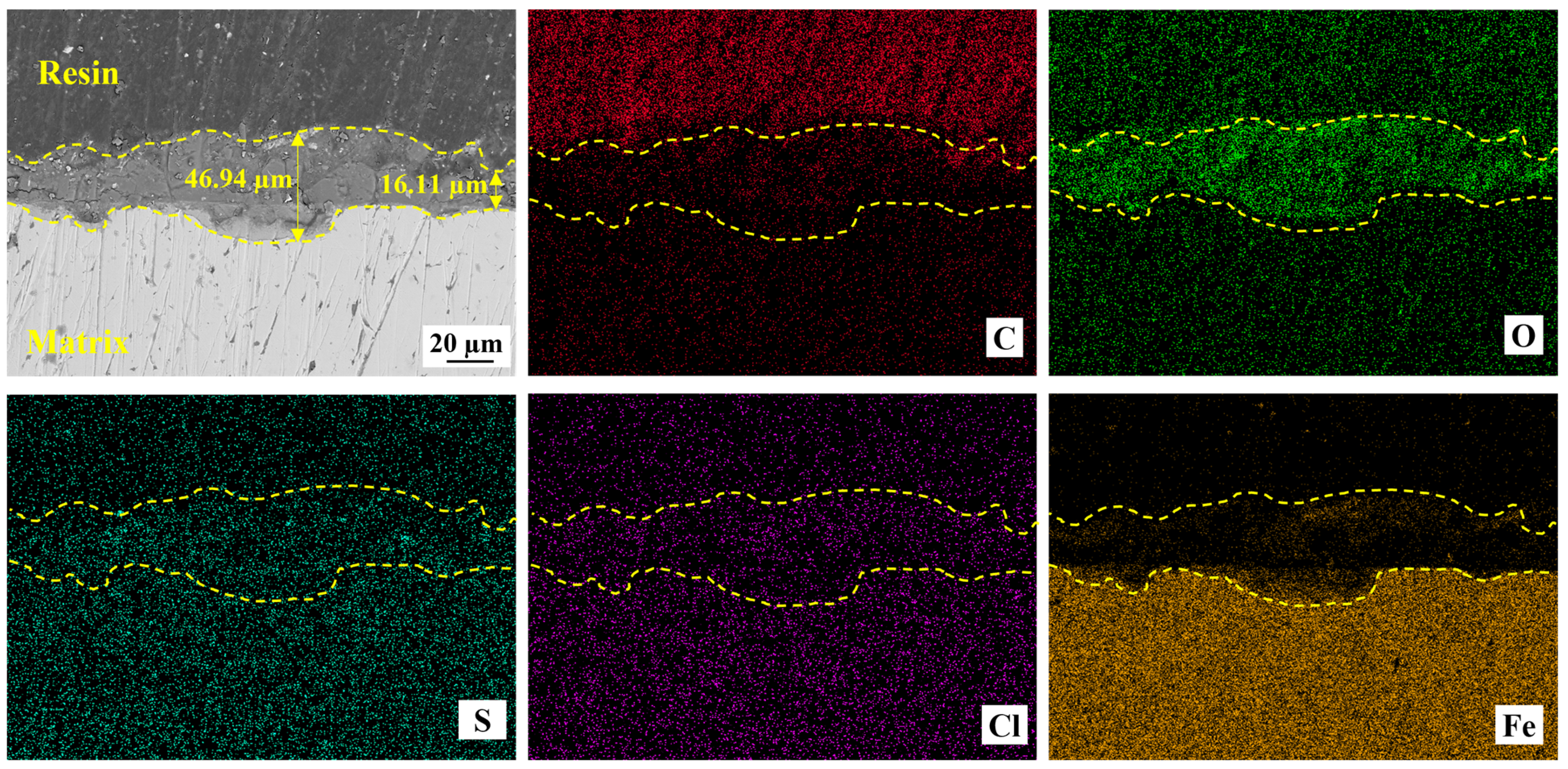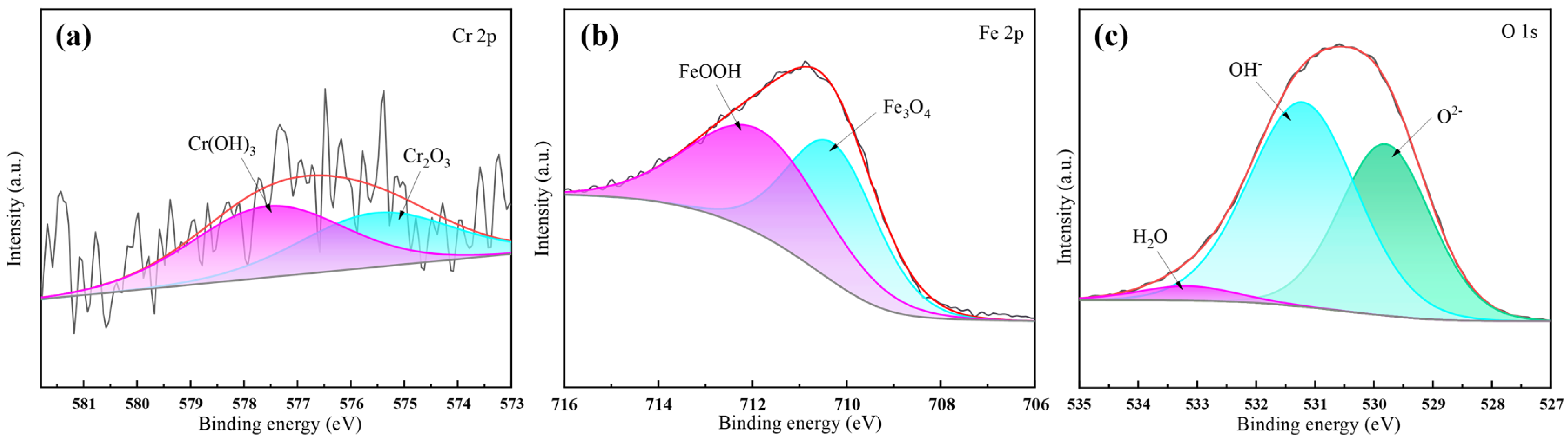 - Raman and XPS analyses reveal that the corrosion products on the fracture surface comprise FeOOH (including α-FeOOH and γ-FeOOH), Fe3O4, and Cr(OH)3, with a total corrosion-product layer thickness of 46.94 µm.