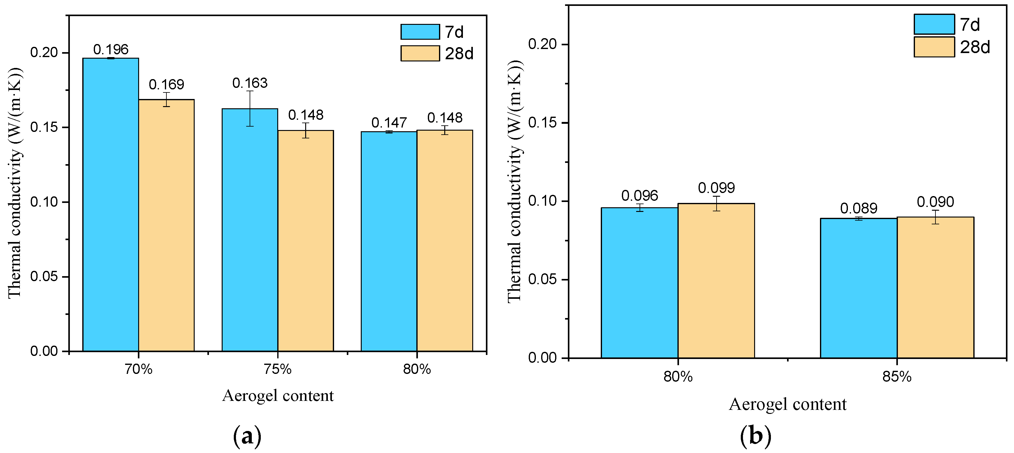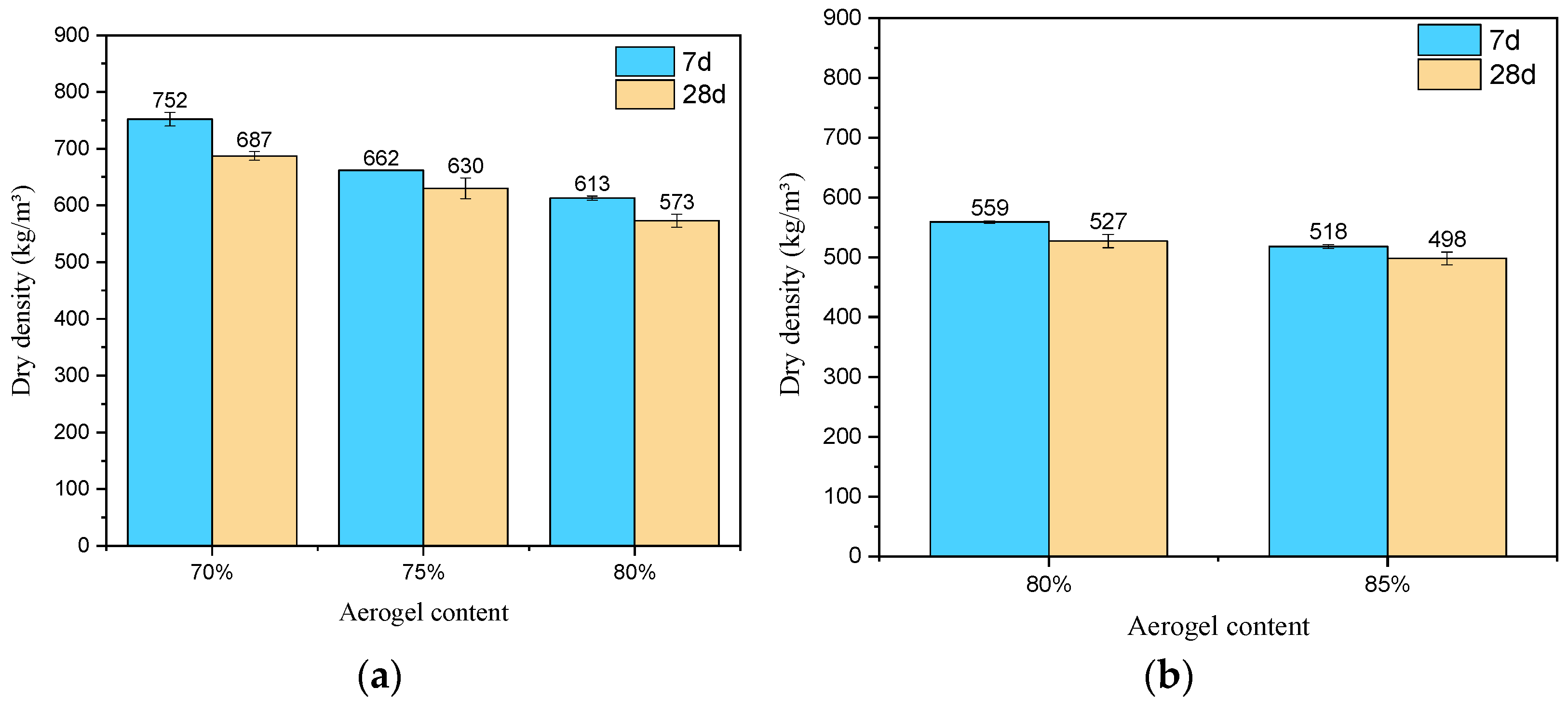 - Increasing the aerogel content and W/B ratio reduces the dry density, thermal conductivity, and compressive strength of GBAC. The dry density generally decreases with prolonged curing age. A baseline mixture with 70% aerogel and a W/B ratio of 0.6 can achieve a dry density of 687 kg/m3, a thermal conductivity of 0.17 W/(m·K), and a compressive strength of 3.01 MPa.
