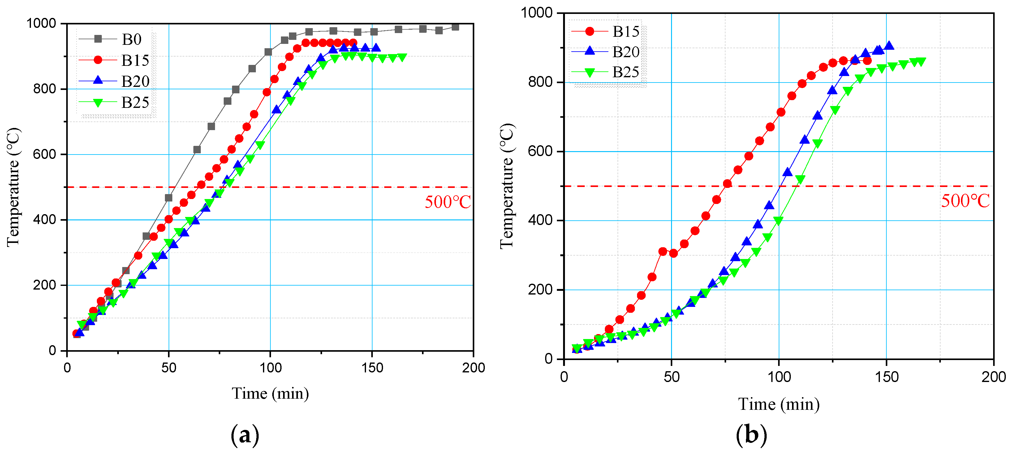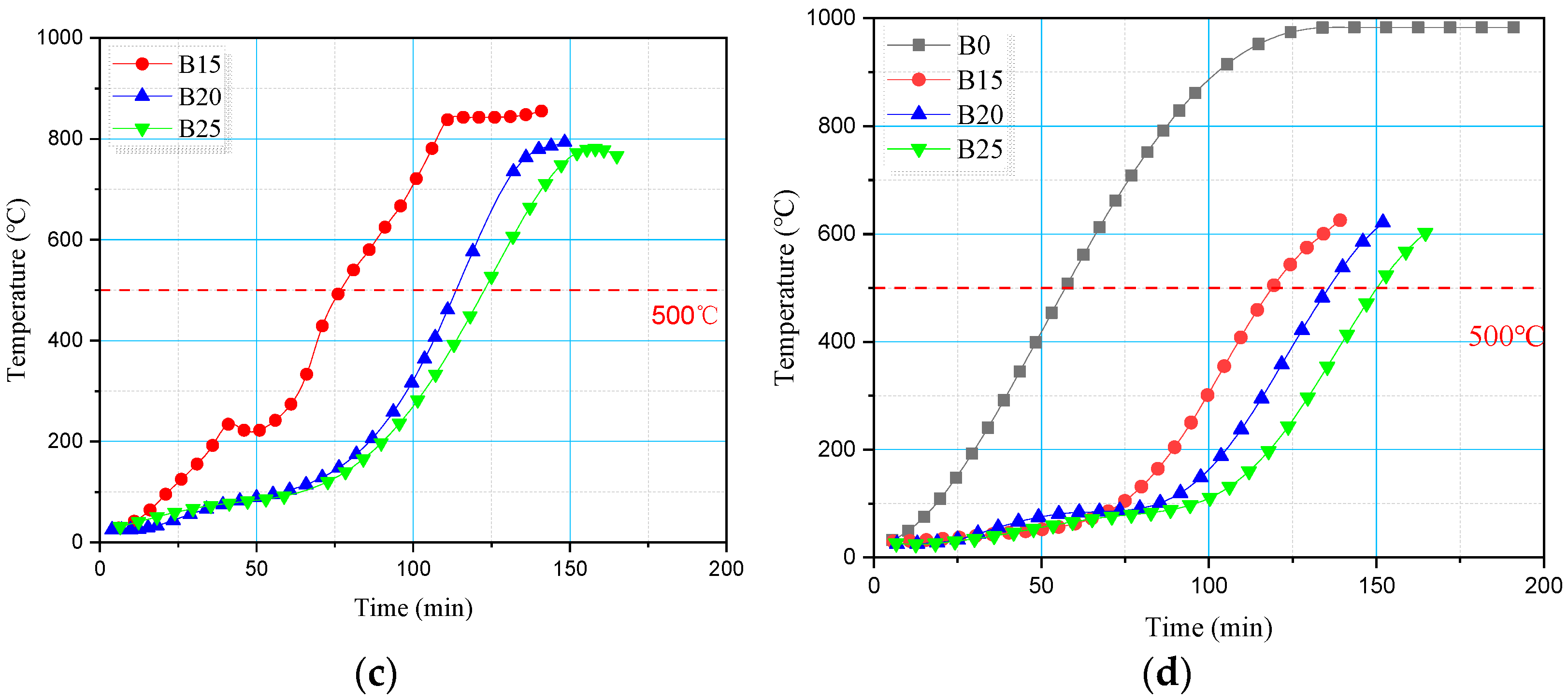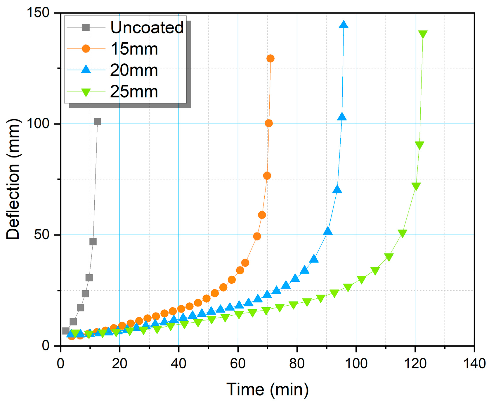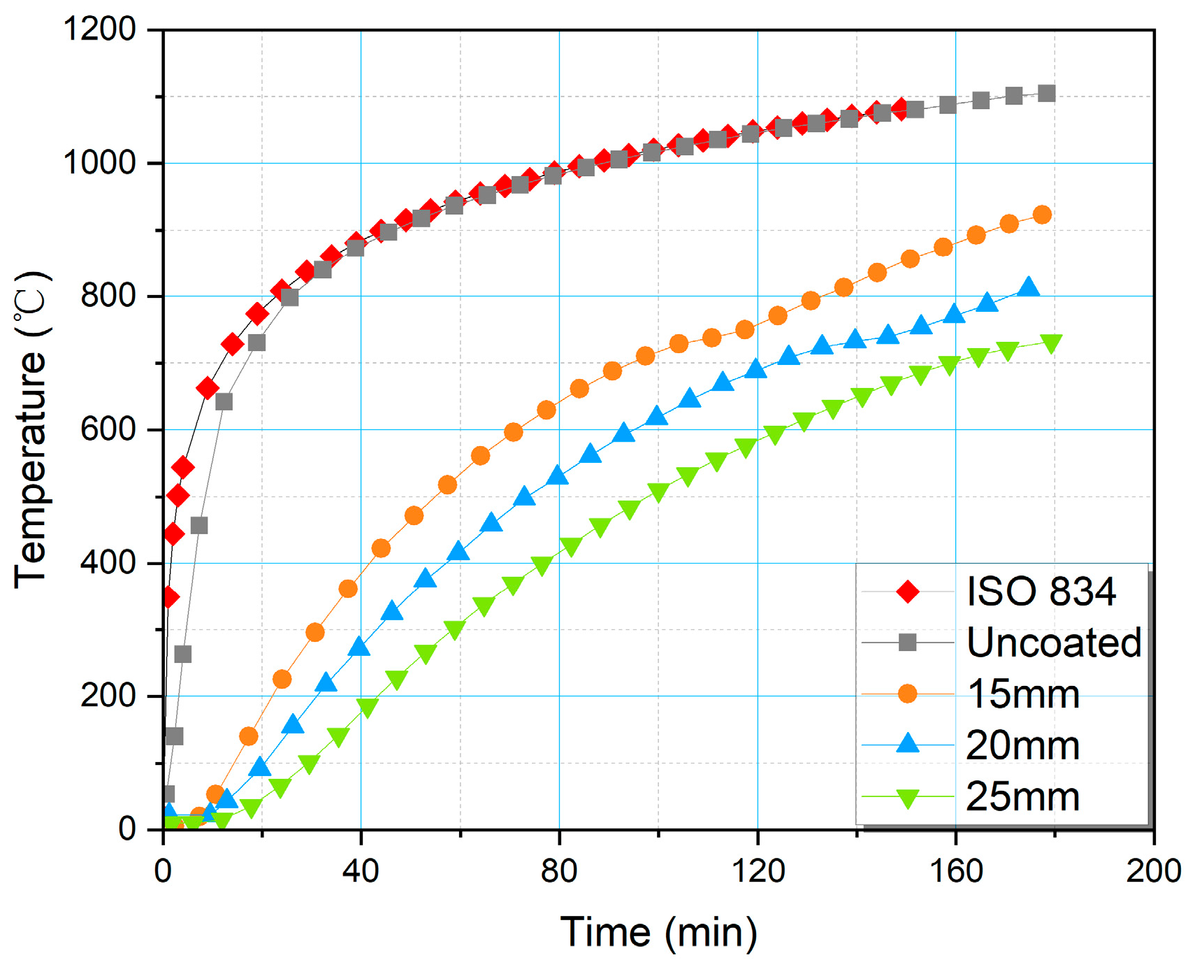 - The GBAC demonstrates excellent structural integrity and thermal insulation under high temperatures. After exposure to 1000 °C, the coating remains intact without spalling. Applied at thicknesses of 15, 20, and 25 mm, the GBAC coating extends the thermal insulating efficiency of the steel plates by 66, 84, and 108 min, respectively.