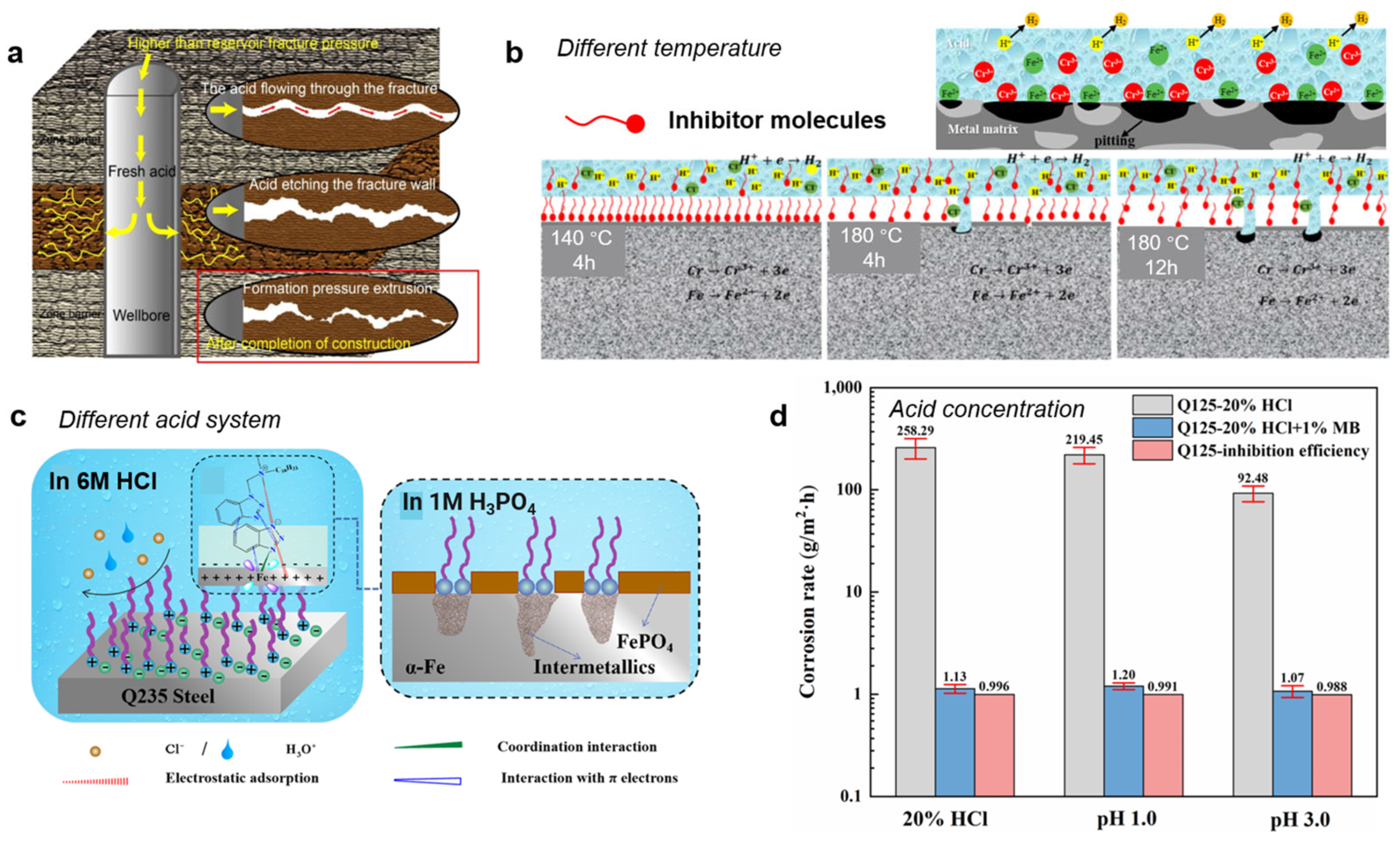 - Li, D.; Song, W.; Zhang, J.; Yin, C.; Zhao, M.; Chao, H.; Zhang, J.; Lei, Z.; Fan, L.; Liu, W.; et al. Corrosion Inhibition Mechanism of Ultra-High-Temperature Acidizing Corrosion Inhibitor for 2205 Duplex Stainless Steel. Materials 2023, 16, 2358. [Google Scholar] [CrossRef]