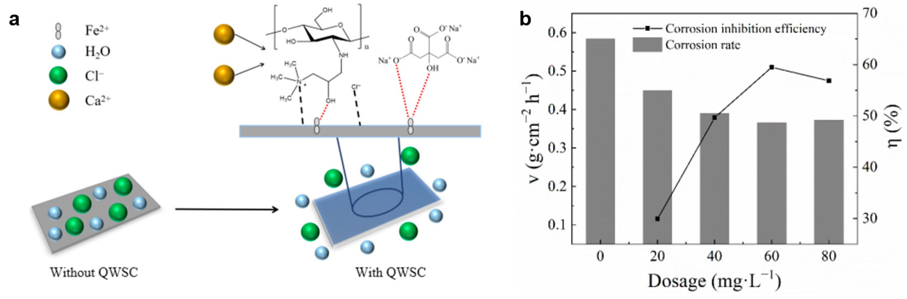 - Xiang, J.; Mo, C.; Peng, C.; Yang, L.; Wan, T.; Song, Y.; Lei, X.; Liu, P.; Gao, B.; Ren, D.; et al. An Evaluation of the Corrosion Inhibition Performance of Chitosan Modified by Quaternary Ammonium Salt for Carbon Steel in Stone Processing Wastewater. Molecules 2024, 29, 3401. [Google Scholar] [CrossRef]