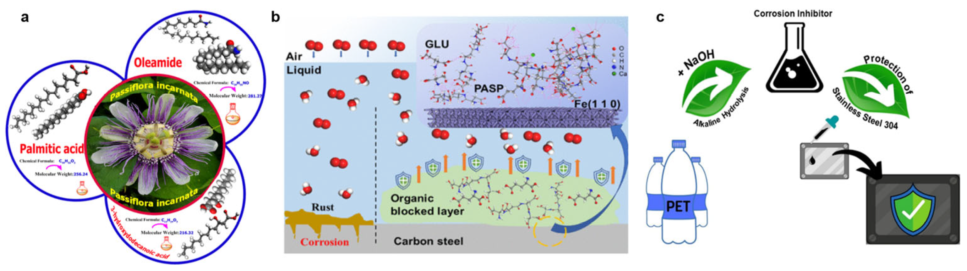 - Alamry, A.Y.H.; Al-Subaie, N.S.; Alshahrani, W.S.; Shanab, M.; Motawea, M.M. Exploring the Experimental and Theoretical Studies and Inhibition Mechanism of Passiflora Incarnata Extract as a Novel Green Inhibitor for API 5CT N80 in an Aggressive Environment. ACS Omega 2024, 9, 44697–44713. [Google Scholar] [CrossRef]