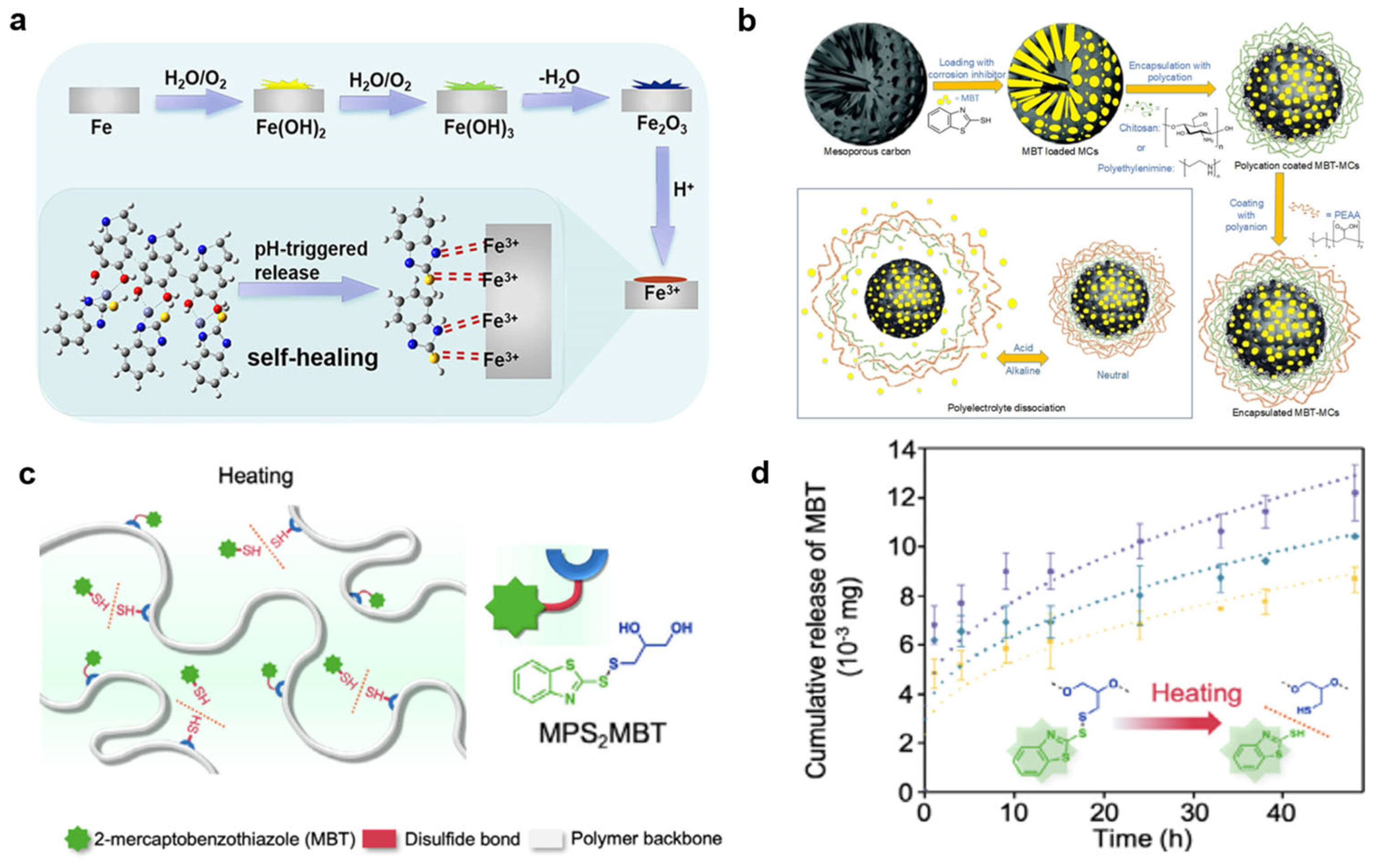 - Liu, Q.; Li, H.; Kong, L.; Du, Y.; Da, Y.; Sun, Z.; Dong, Y.; Zhang, W.; Liu, Y.; Tian, X.; et al. High-Loading Smart Carrier Containing 2-Mercaptobenzimidazole-Zn2+-Polydopamine with pH-Responsive Function to Fabricate High-Performance Waterborne Epoxy Anticorrosion Coatings. ACS Appl. Mater. Interfaces 2024, 16, 19651–19662. [Google Scholar] [CrossRef]