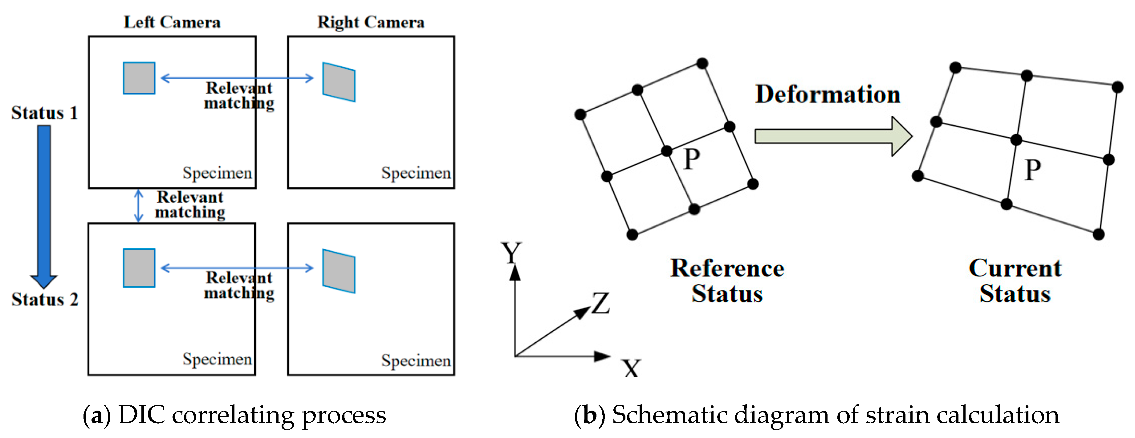 A representative DIC-based strain calculation method is presented below. During the deformation process, a dual-camera system captures 2