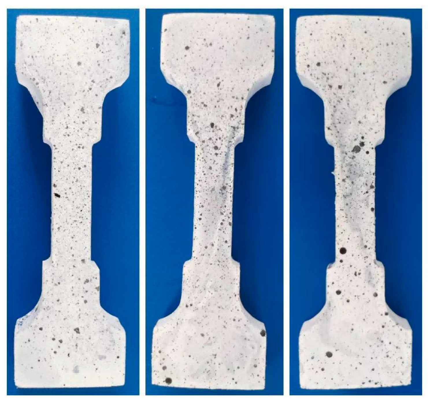 Speckle Spraying: For DIC imaging analysis, speckles need to be sprayed on the ice specimens after freezing is complete. To ensure success, oil-based spray paint is used to apply the speckles, preventing the paint from dissolving in the ice and causing unclear speckles. Immediately after spraying, the specimen must be returned to the freezing chamber to avoid condensation of moisture from the air on the specimen surface, which could obscure the speckles. During the test, it is also necessary to control the ambient temperature and humidity and appropriately increase the exposure in the imaging area to achieve better results. The picture of ice tensile specimens after speckle spraying is shown in