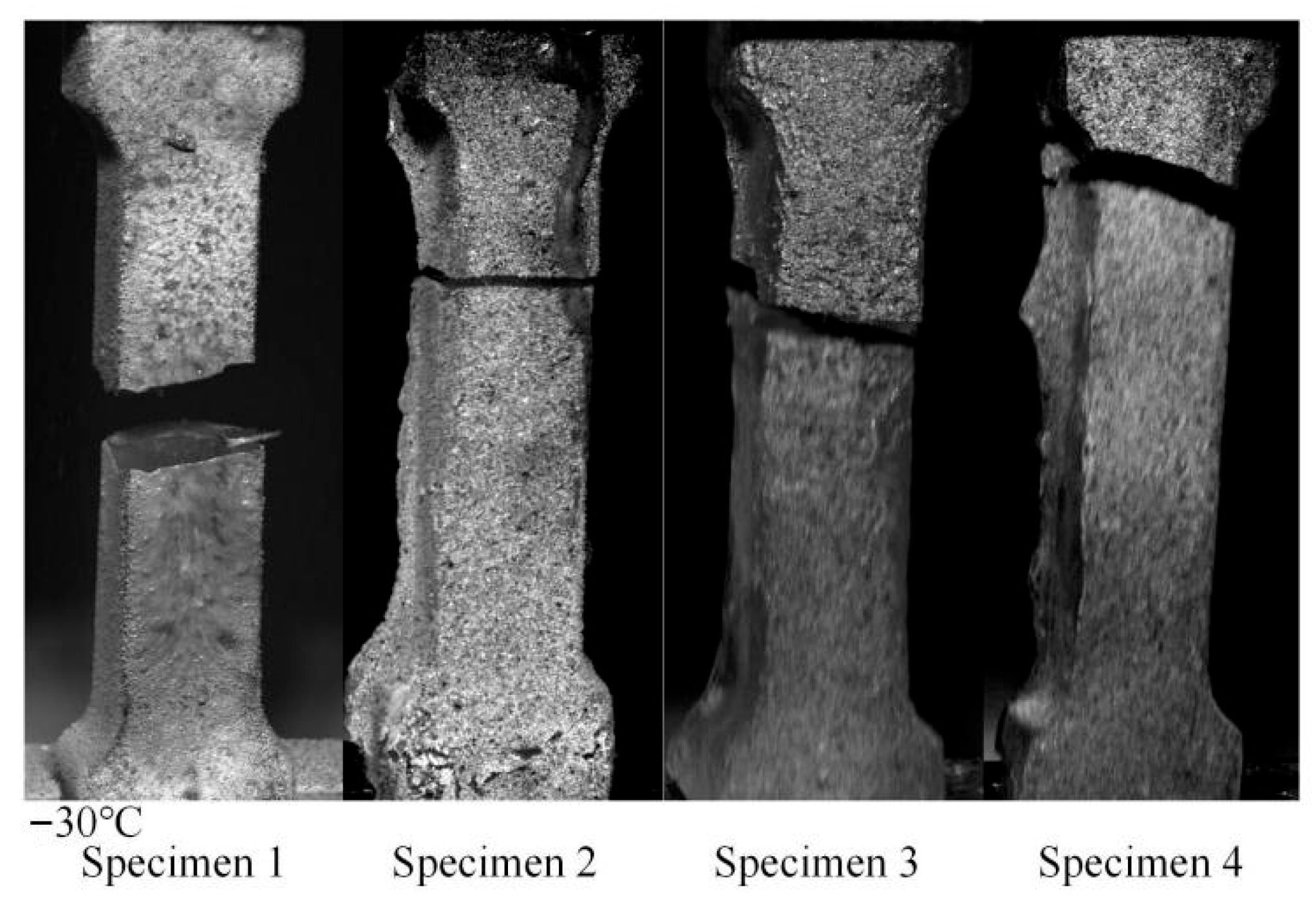 From the fracture phenomena observed, the freezing temperature of the specimens has a minimal influence on the failure behavior. Tensile failure shows the characteristics of brittle fracture. The fracture positions are all concentrated in the test section of the specimen, as expected in the design of the specimen’s shape, as shown in
