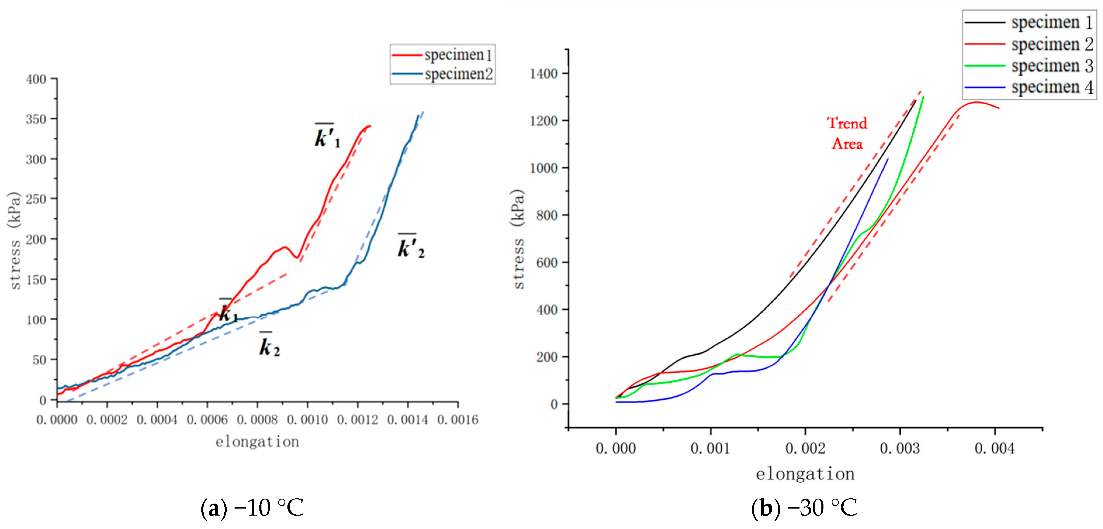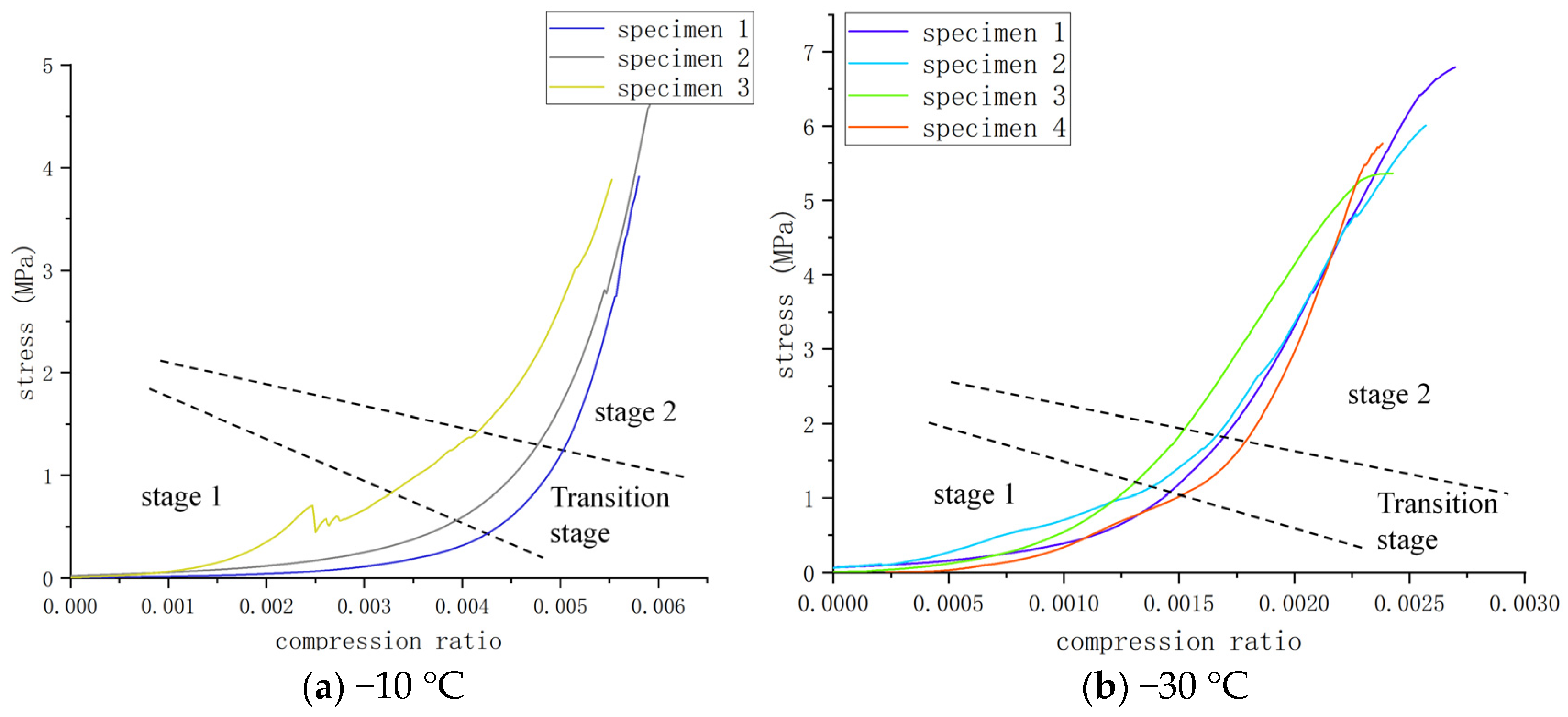 Figure 12b show good consistency in shape and trend. It can be concluded that the constitutive relationship of ice materials is more stable when the freezing temperature is lower. Same as the −10 °C curve, this compression curve can also be divided into stage 1 and stage 2 with better linearity; between these two stages is a smooth transition stage. The
