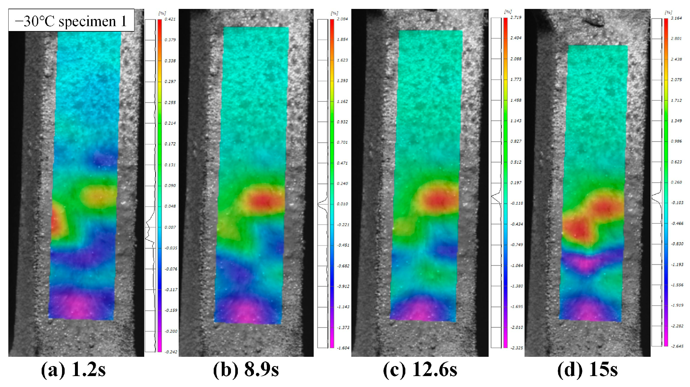 D graphics obtained by the dual cameras must be used for DIC analysis. For Specimen 4 in the −30 °C test group, the evolution of strain on the test section surface was processed by the DIC system, which is shown in