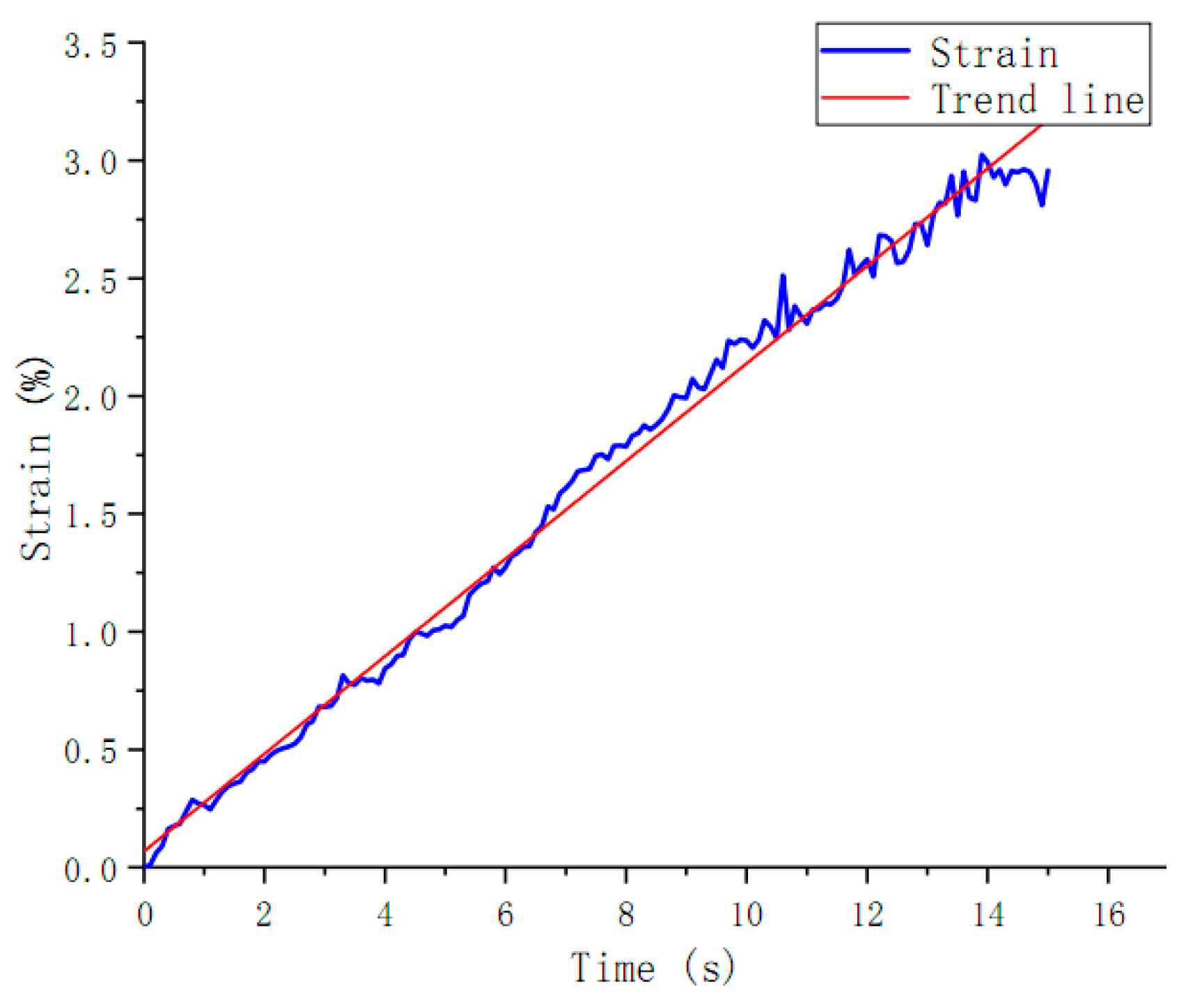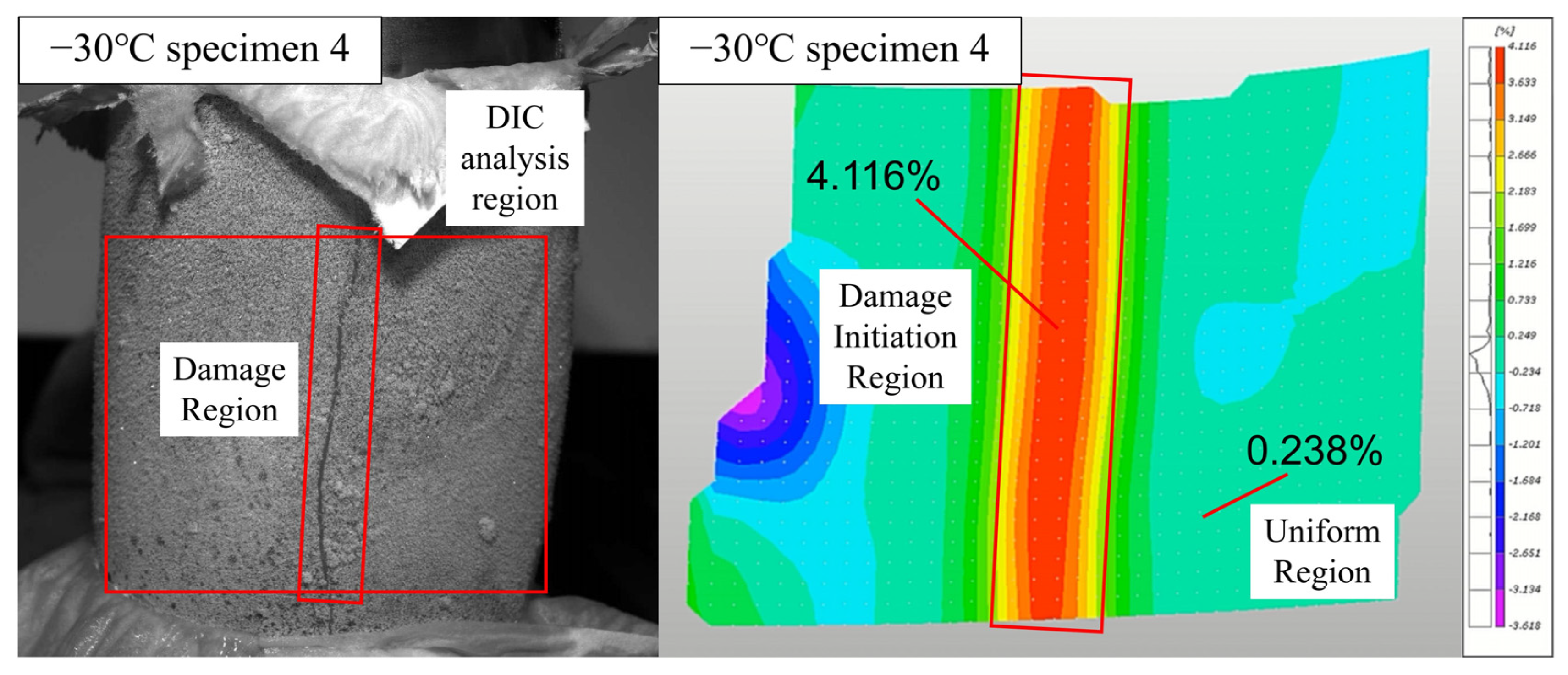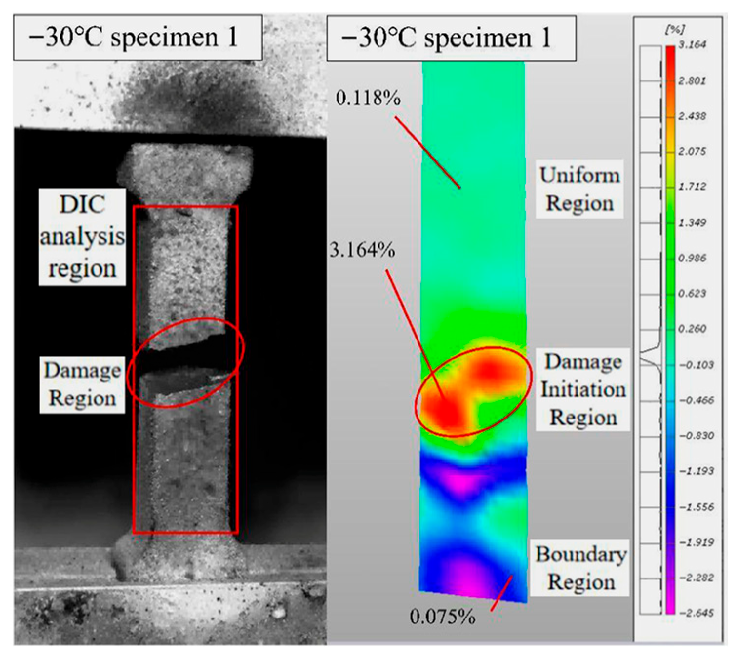 Figure 8) revealed significant differences. The strain data obtained from the universal testing machine were 0.32%, which is much lower than the local strain value of 2.922% measured by DIC in the damage region but significantly higher than the uniform region strain value of 0.118% and the boundary region strain value of 0.075% in the strain map of
