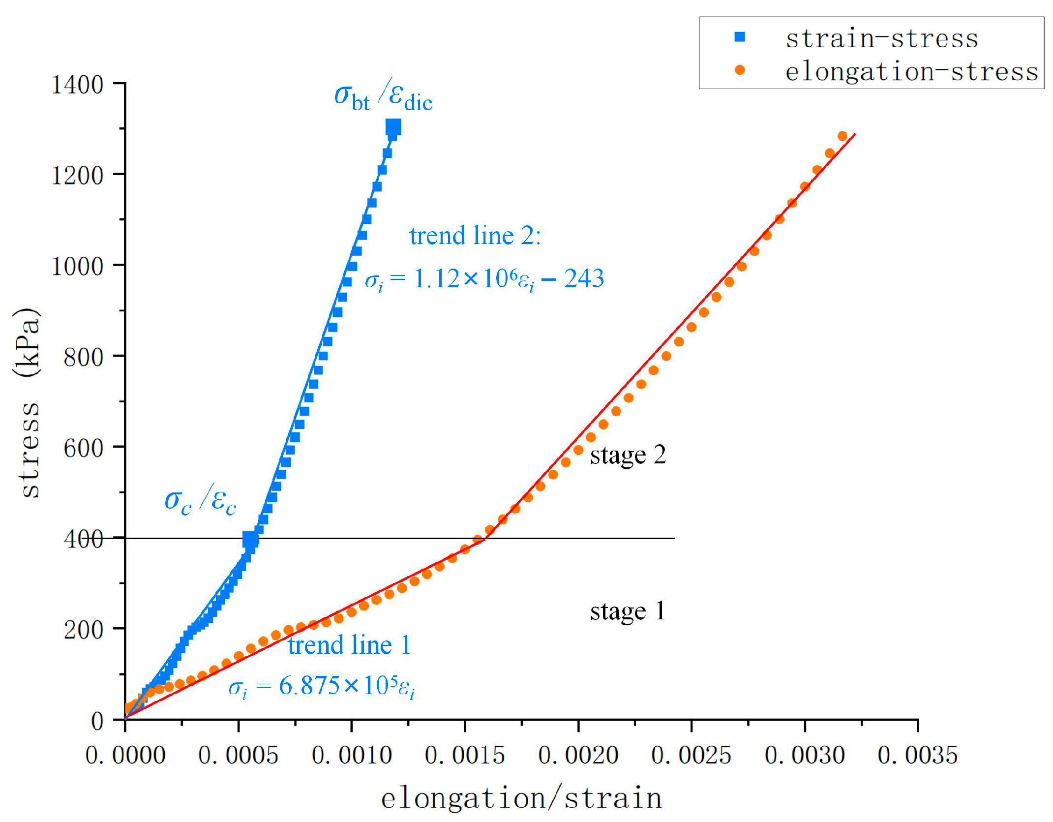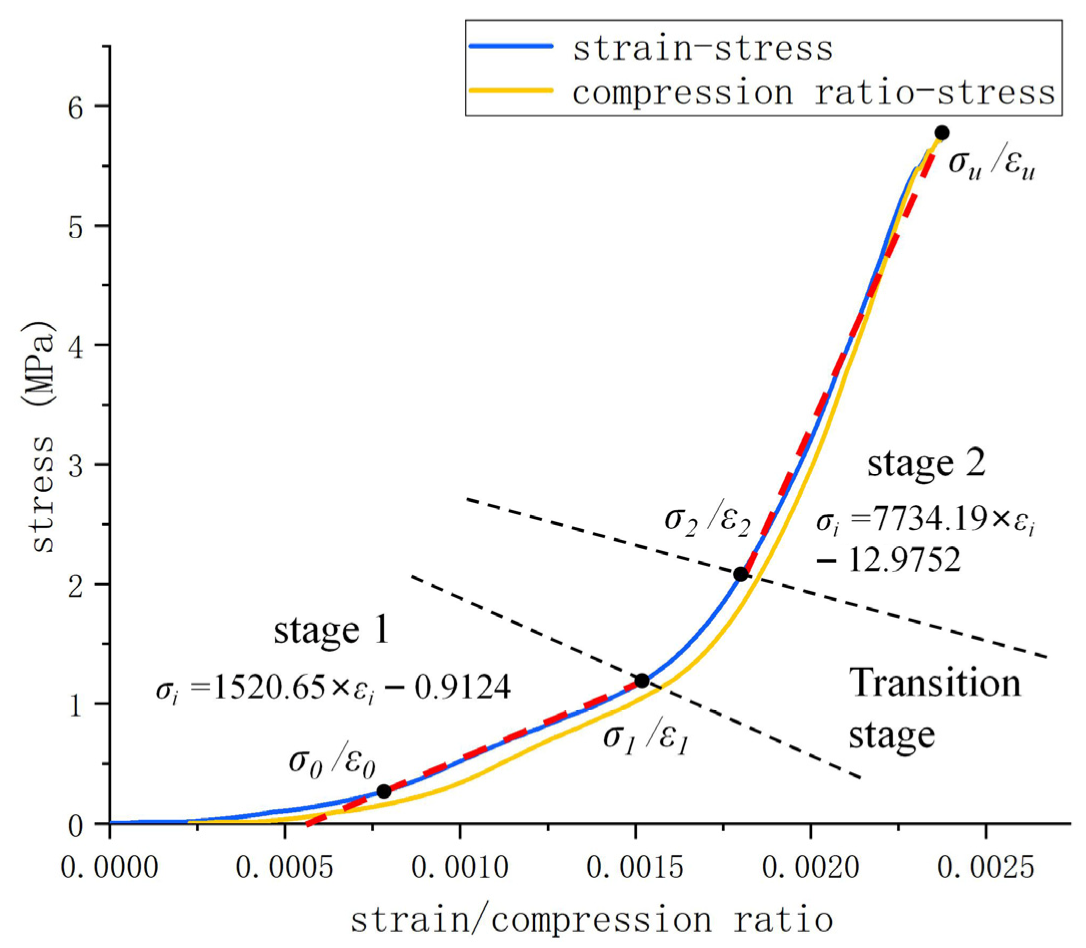 Figure 15, after the experiment began loading, the stress and strain values are relatively low, and the linearity is significantly affected by measurement errors. Then, the stress–strain curve begins to enter linear stage 1 at a strain of 0.08% (