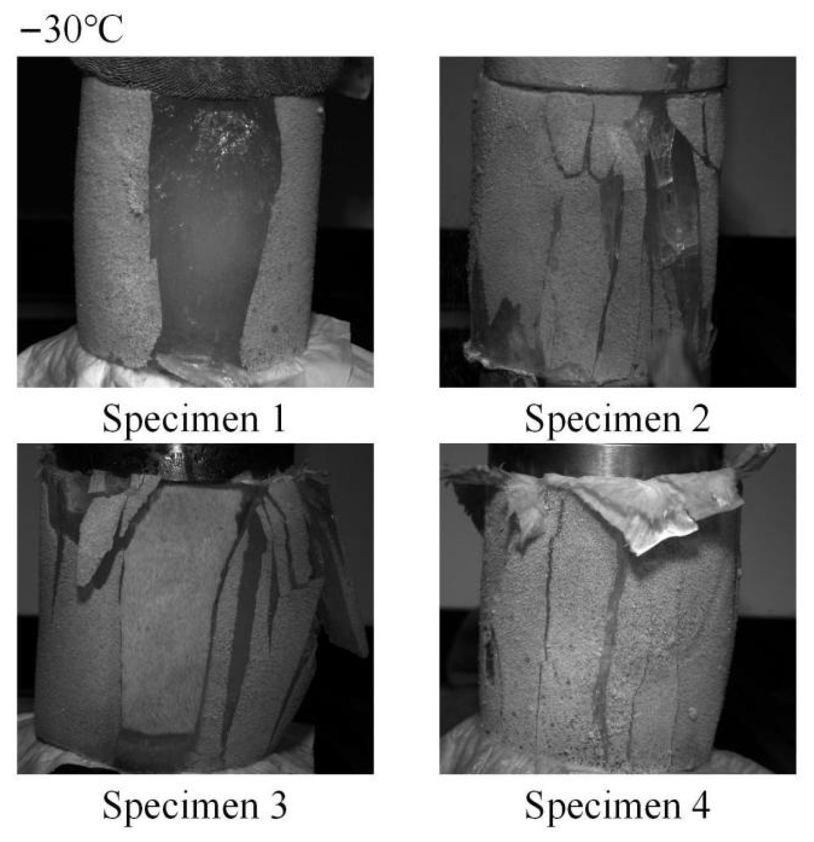 For both the −10 °C and −30 °C specimen groups, the experimental phenomena during the compression tests were essentially the same. In the early stage of the test, the specimens underwent uniform compressive deformation as a whole. Due to boundary effects, slight crushing occurred at the ends of the specimens in contact with the compression heads. As the compression increased, the specimens exhibited noticeable radial expansion until cracks appeared on the outer surface of the specimen sides, followed by fragmentation and a sharp decline in the specimens’ load-bearing capacity, as shown in