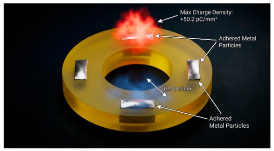 Gao et al. measured the surface charge accumulation characteristics of a 100-kV GIE epoxy insulator. Under negative DC voltage, positive charges were found to concentrate in non-planar regions of elliptical speckles, with the highest charge density near the high-voltage electrode. The coverage area expanded with increasing voltage, as illustrated in Figure 3. The radial bimodal distribution was formed by the competition among three conduction paths, with gas conduction dominating the charge accumulation process. They concluded that on insulators with complex surface topography, charge accumulation behavior is primarily governed by gas conduction, and that grounded metallic particles significantly promote local charge accumulation by distorting the electric field [38,39].