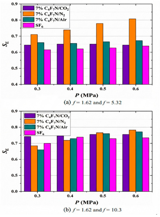 Kieffel et al. reported that the negative lightning impulse breakdown voltage of 4–10% C4F7N/CO2 mixtures at 0.67–0.82 MPa reached 87%–96% of that of SF6 at 0.55 MPa [65]. Zhang et al. from Xi’an Jiaotong University investigated the lightning impulse characteristics of C4F7N/CO2 mixtures under varying degrees of electric field non-uniformity, as shown in Figure 6. Experiments revealed that under slightly non-uniform fields, the U50 of the gas mixture increased in an approximately linear manner with gas pressure [66]. Furthermore, U50 decreased markedly as the field non-uniformity increased, indicating that highly non-uniform electric fields should be avoided as much as possible in the design of HVDC GIE.