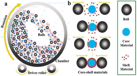 Of the different kinds of mechanical coating methods, the ball milling method (Figure 2) is the most useful and widely used in industrial applications [12]. The effectiveness of the ball milling method is highly dependent on several critical parameters, which determine the energy input, coating quality, and reproducibility. Among these, milling speed, ball-to-powder ratio (BPR), milling time, and the size and material of the milling media are the most influential [13,14,15]. For example, variations in rotational speed directly affect the collision energy and frequency, thereby influencing coating adhesion and particle refinement [16,17]. Similarly, an optimized BPR is essential to balance sufficient energy transfer while avoiding excessive cold welding or contamination [18,19]. Milling time determines the extent of particle deformation and alloying, while the selection of milling media and process control agents (PCA) significantly impacts contamination levels and surface purity [13,14,20,21,22].