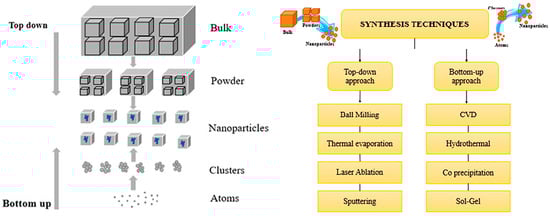 - Abid, N.; Khan, A.M.; Shujait, S.; Chaudhary, K.; Ikram, M.; Imran, M.; Haider, J.; Khan, M.; Khan, Q.; Maqbool, M. Synthesis of nanomaterials using various top-down and bottom-up approaches, influencing factors, advantages, and disadvantages: A review. Adv. Colloid Interface Sci. 2022, 300, 102597. [Google Scholar] [CrossRef]