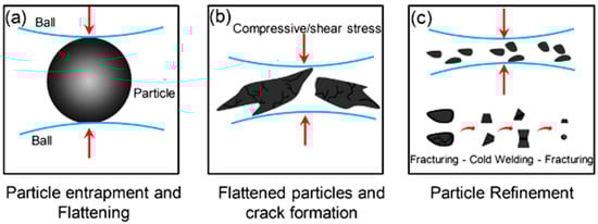 Principle of mechanical alloying by the HEBM process. (a) Particle entrapment and flattening during ball-particle collision, (b) Deformation of particles by flattening and propagation of cracks, (c) Particle refinement undergoes cold-welding and agglomeration that increase particle size. Modified with permission from ref. [49] Copyright 2016 Journal of Environmental Management.