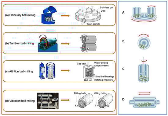 Different types of ball milling and its working principles: (a) Planetary ball milling and (A) its cylinder rotation direction, (b) Tumbler ball milling and (B) its cylinder rotation direction, (c) Attrition ball milling and (C) its cylinder rotation direction, and (d) Vibration ball milling (where f is vibration frequency, A is vibration amplitude, and ω is angular velocity) and (D) its cylinder rotation direction. Modified from ref. [24,25].