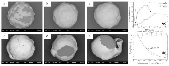 As illustrated in Figure 17g, it can be observed that the average thickness initially increased, reached its peak, and then subsequently decreased, regardless of the rotation speeds of 200, 300, or 400 rpm. Higher rotation speeds expedited the evolution of the average thickness. These findings align well with the previously discussed analysis on the evolution of the coatings. Figure 17h illustrates the time required to form continuous Zn coatings, denoted as t, as a function of the collision strength or collision power. The constant C (h) is influenced by the characteristics of the metal powder particles and the grinding balls. D and F are negative constants determined by the geometry of the bowl and planetary ball mill, as well as the size of the grinding balls. The dimensional units for D and F are m2·s·N−1 and m2·s·J−1, respectively. In this study, C was calculated to be e4.52, while D and F were found to be −2.01 × 10−2 and −9.12 × 10−2, respectively. The variable ωp represents the rotation speed of the planetary ball mill (rad·s−1), while ωb denotes the rotation speed of the bowl, which is equal to ωp/Tr. K is a constant based on the ball diameter and is estimated to be approximately 1.5 (r−1) for balls with diameters ranging from 8 to 10 mm. Due to the lack of data for balls with a diameter of 1 mm, the influence of the ball diameter in this case is considered negligible. Therefore, the values for the 8–10 mm diameter balls will be utilized to evaluate the collision frequency for an Al2O3 ball.