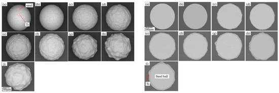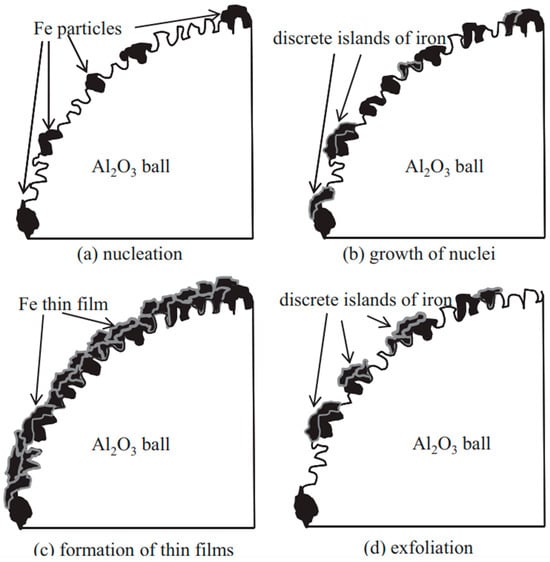Subsequently, additional zinc clusters transferred and adhered to the surfaces of Al2O3 balls or to the existing Zn nuclei. The increase in size of the Zn nuclei is due to cold welding between the Zn powder particles and the nuclei, leading to the formation of discrete Zn islands. This mode of film growth is referred to as island-type or Volmer–Weber growth [68]. Following this, Zn particles attached themselves to the discrete islands and the nuclei, resulting in the coalescence of these islands; this phase is known as the formation and coalescence of discrete islands. The mechanical interlocking of Zn particles with the surface irregularities of the Al2O3 balls likely promoted the formation of these discrete islands [69]. During this stage, the surface coverage of Al2O3 balls with Zn increased rapidly. Cold welding was the predominant mechanism at this point. In the third stage, the surfaces of the Al2O3 balls became coated with Zn, culminating in nearly 100% surface coverage. This indicates the formation of continuous Zn coatings. Then, the cold welding between the zinc particles and the coatings continued, resulting in an increase in the thickness of the coatings. This phase is referred to as the formation and thickening of continuous coatings. In the final stage, the continuous Zn coatings began to peel off. During the development of these continuous coatings, internal stress was induced due to work hardening and the discrepancies in the thermal expansion coefficients of the Al2O3 ball coatings. As the thickness of the coatings increased, so did the internal stress. This internal stress subsequently weakened the adhesion of the coatings to the surfaces of the Al2O3 balls.