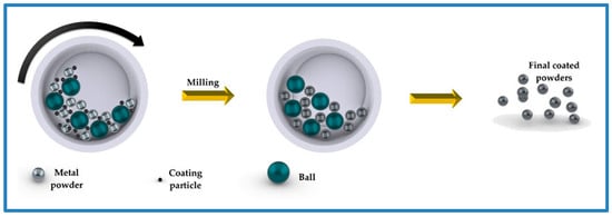 Surface engineering and coatings of powders are methods used to coat particles and enhance their surface properties. This is performed to improve the functional properties of materials, including wear resistance, corrosion resistance, and mechanical strength. The particle’s surface is significantly modified to reach these goals, which is why a huge proportion of the total cost of the production process is dedicated to the coating step. Since “simple mixing or blending” is insufficient to produce appropriate coating layer characteristics for relevant applications, many techniques have been developed to control the surface’s properties through the coating steps, including mechanical operations, with the lowest functional cost [1,2,3,4]. Traditional coating methods such as chemical vapor deposition (CVD), physical vapor deposition (PVD), and electroplating have limitations related to cost, complexity, and environmental concerns. Mechanical coating methods, particularly ball milling, offer a more sustainable and cost-effective alternative.