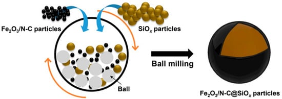 - Lim, A.S.; Kim, J.; Hwa, Y.; Cho, K.Y.; Yoon, S. Fe2O3/N-doped carbon-modified SiOx particles via ionic liquid as anode materials for Li-ion batteries. J. Appl. Electrochem. 2022, 52, 1163–1171. [Google Scholar] [CrossRef]