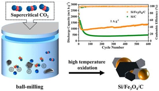 - Hu, L.; Lu, Z.; Chen, F.; Zhang, J.; Xia, Y.; Zhang, W.; Gan, Y.; He, X.; Song, W.; Huang, H. Supercritical-assisted ball-milling synthesis of multicomponent Si/Fe3O4/C composites for outstanding lithium-storage capability. Energy Fuels 2023, 37, 8042–8050. [Google Scholar] [CrossRef]